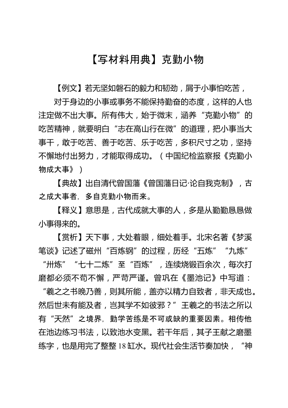 【寫材料用典】克勤小物【例文】若無堅(jiān)如磐石的毅力和韌勁,屑于小事怕吃苦,對(duì)于身邊的小事或事務(wù)不能保持勤奮的態(tài)度,這樣的人也注定做不出大事。所有偉大,始于微末,涵養(yǎng)“克勤小物”的吃苦精神,就要明白“志在高山行在微”的道理,把小事當(dāng)大事干,敢于吃苦、善于吃苦、樂于吃苦,多積尺寸之功,堅(jiān)持不懈地付出努力,才能取得成功。(中國紀(jì)檢監(jiān)察報(bào)《克勤小物成大事》)【典故】出自清代曾國藩《曾國藩日記·論自我克制》,古之成大事者,多自克勤小物而來?!踞屃x】意思是,古代成就大事的人,多是從勤勤懇懇做小事得來的?!举p析】天下事,大處著眼,細(xì)處著手。...