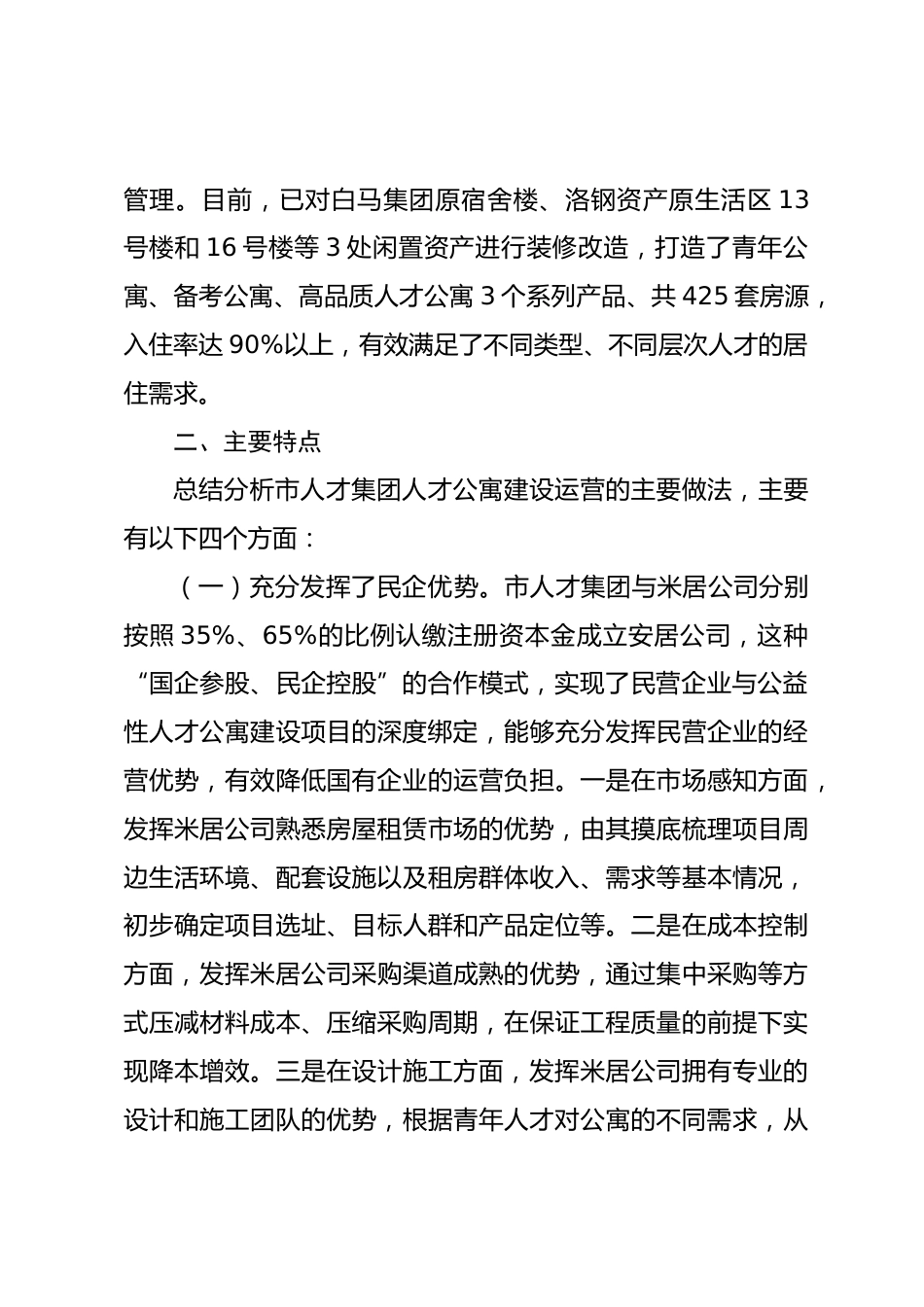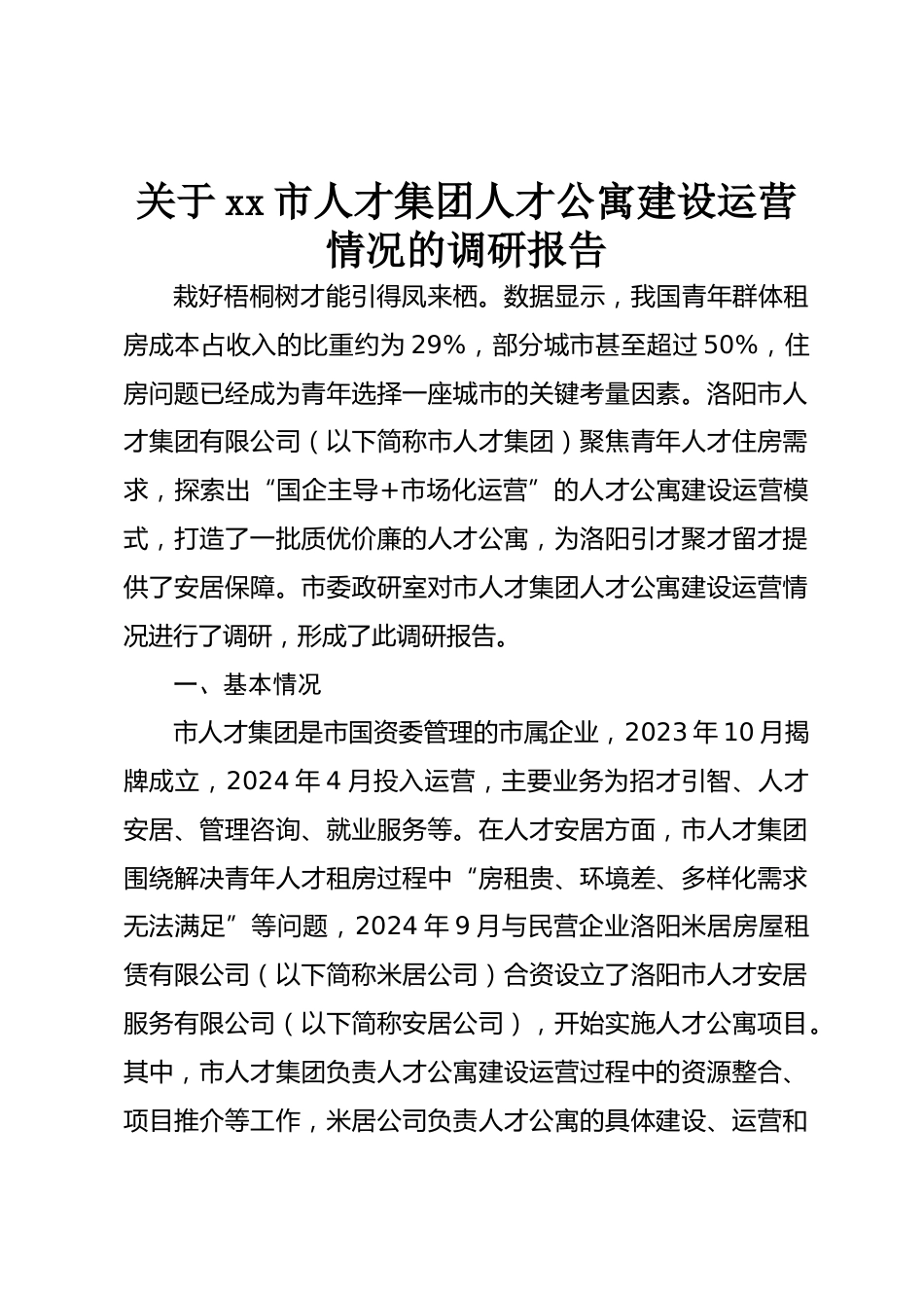 關(guān)于xx市人才集團人才公寓建設(shè)運營情況的調(diào)研報告栽好梧桐樹才能引得鳳來棲。數(shù)據(jù)顯示,我國青年群體租房成本占收入的比重約為29%,部分城市甚至超過50%,住房問題已經(jīng)成為青年選擇一座城市的關(guān)鍵考量因素。洛陽市人才集團有限公司(以下簡稱市人才集團)聚焦青年人才住房需求,探索出“國企主導(dǎo)+市場化運營”的人才公寓建設(shè)運營模式,打造了一批質(zhì)優(yōu)價廉的人才公寓,為洛陽引才聚才留才提供了安居保障。市委政研室對市人才集團人才公寓建設(shè)運營情況進行了調(diào)研,形成了此調(diào)研報告。一、基本情況市人才集團是市國資委管理的市屬企業(yè),2023年10月揭牌成立,2024年4月投入運...