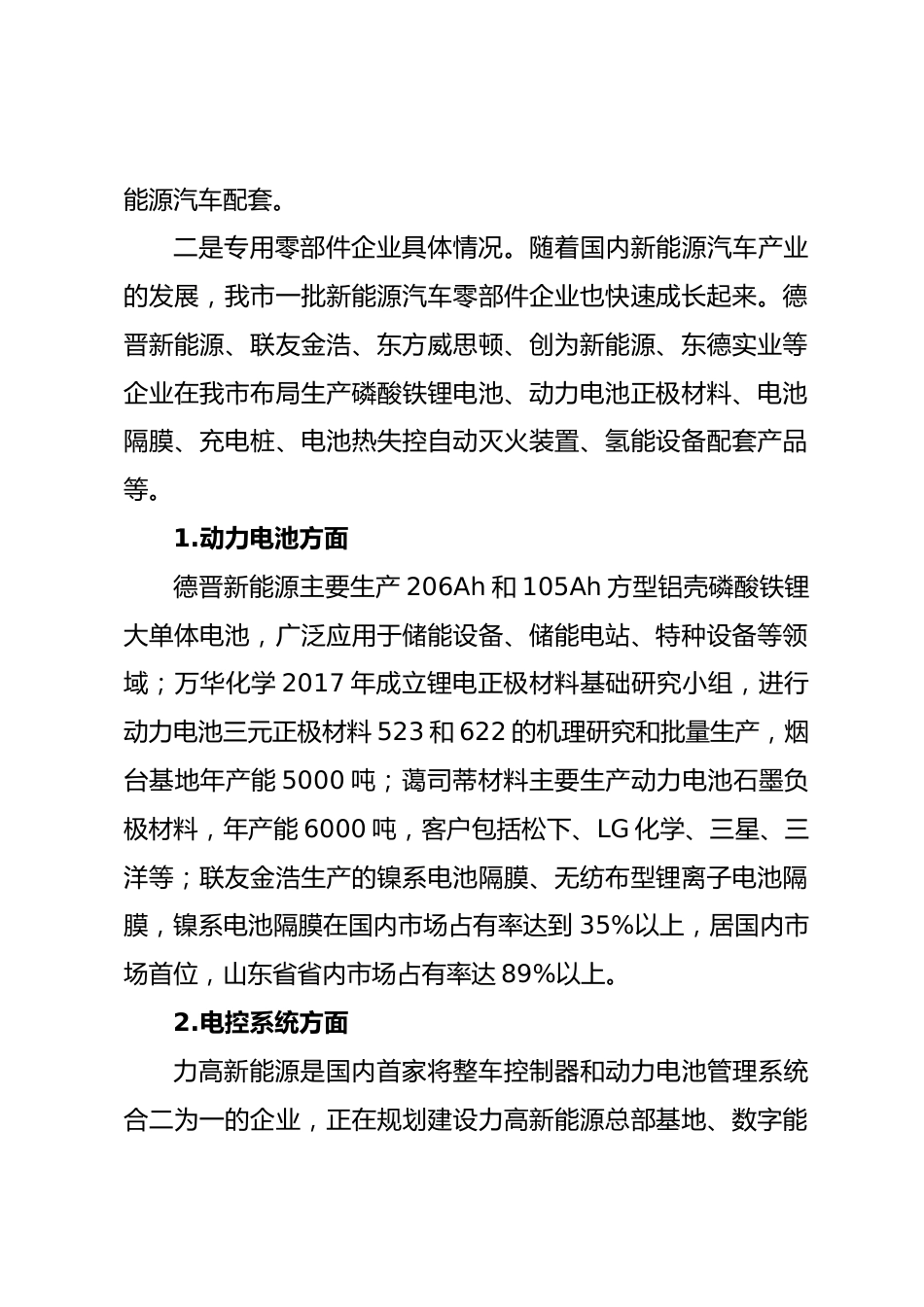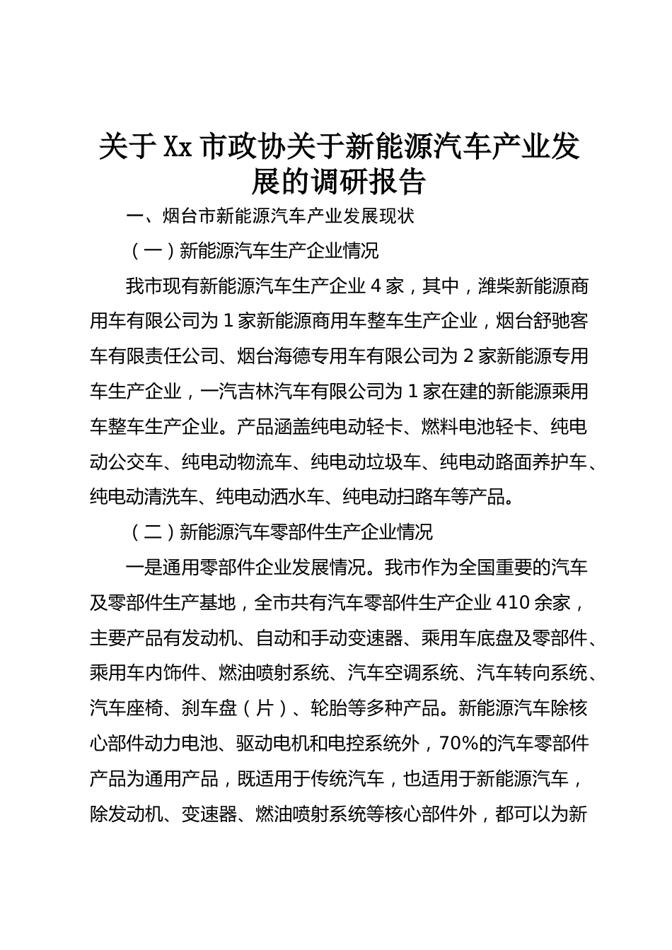 關(guān)于Xx市政協(xié)關(guān)于新能源汽車產(chǎn)業(yè)發(fā)展的調(diào)研報(bào)告一、煙臺(tái)市新能源汽車產(chǎn)業(yè)發(fā)展現(xiàn)狀(一)新能源汽車生產(chǎn)企業(yè)情況我市現(xiàn)有新能源汽車生產(chǎn)企業(yè)4家,其中,濰柴新能源商用車有限公司為1家新能源商用車整車生產(chǎn)企業(yè),煙臺(tái)舒馳客車有限責(zé)任公司、煙臺(tái)海德專用車有限公司為2家新能源專用車生產(chǎn)企業(yè),一汽吉林汽車有限公司為1家在建的新能源乘用車整車生產(chǎn)企業(yè)。產(chǎn)品涵蓋純電動(dòng)輕卡、燃料電池輕卡、純電動(dòng)公交車、純電動(dòng)物流車、純電動(dòng)垃圾車、純電動(dòng)路面養(yǎng)護(hù)車、純電動(dòng)清洗車、純電動(dòng)灑水車、純電動(dòng)掃路車等產(chǎn)品。(二)新能源汽車零部件生產(chǎn)企業(yè)情況一是通用零部件企業(yè)發(fā)展情況...