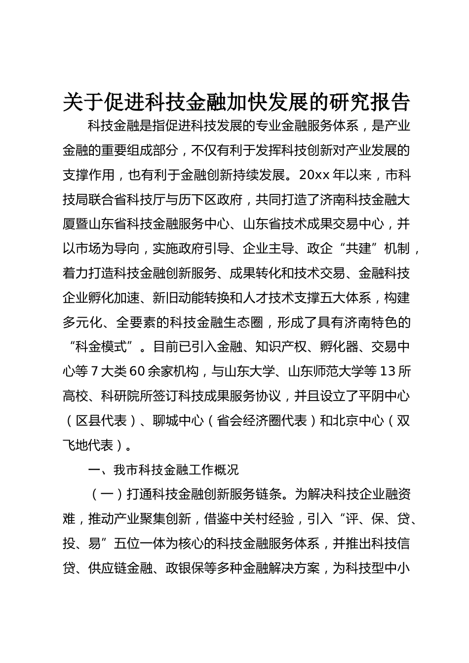 關于促進科技金融加快發(fā)展的研究報告科技金融是指促進科技發(fā)展的專業(yè)金融服務體系,是產(chǎn)業(yè)金融的重要組成部分,不僅有利于發(fā)揮科技創(chuàng)新對產(chǎn)業(yè)發(fā)展的支撐作用,也有利于金融創(chuàng)新持續(xù)發(fā)展。20xx年以來,市科技局聯(lián)合省科技廳與歷下區(qū)政府,共同打造了濟南科技金融大廈暨山東省科技金融服務中心、山東省技術成果交易中心,并以市場為導向,實施政府引導、企業(yè)主導、政企“共建”機制,著力打造科技金融創(chuàng)新服務、成果轉化和技術交易、金融科技企業(yè)孵化加速、新舊動能轉換和人才技術支撐五大體系,構建多元化、全要素的科技金融生態(tài)圈,形成了具有濟南特色的“科金模式”。目...