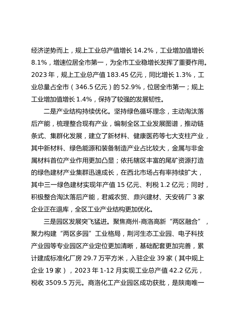 關(guān)于加快商州工業(yè)經(jīng)濟(jì)高質(zhì)量發(fā)展的調(diào)研與思考實(shí)施工業(yè)倍增工程助推經(jīng)濟(jì)提速發(fā)展——工業(yè)是經(jīng)濟(jì)發(fā)展的“壓艙石”,工業(yè)強(qiáng)則經(jīng)濟(jì)強(qiáng)。近年來商州區(qū)緊扣“一都四區(qū)”總目標(biāo)和“五區(qū)”建設(shè)總要求,聚焦“3+N”產(chǎn)業(yè)集群,堅(jiān)定不移推進(jìn)“工業(yè)強(qiáng)區(qū)”戰(zhàn)略,升級(jí)傳統(tǒng)產(chǎn)業(yè)優(yōu)存量,培育新興產(chǎn)業(yè)擴(kuò)增量,做強(qiáng)支柱產(chǎn)業(yè)提質(zhì)量,為全區(qū)經(jīng)濟(jì)社會(huì)高質(zhì)量發(fā)展奠定了堅(jiān)實(shí)基礎(chǔ)。為了全面掌握商州工業(yè)經(jīng)濟(jì)運(yùn)行情況,更好推動(dòng)縣域經(jīng)濟(jì)高質(zhì)量發(fā)展,本人通過走訪商洛比亞迪、陜西鋅業(yè)、延長氟硅等重點(diǎn)規(guī)上工業(yè)企業(yè),認(rèn)真查閱相關(guān)資料,深入開展座談交流,對(duì)全區(qū)工業(yè)經(jīng)濟(jì)發(fā)展現(xiàn)狀和存在問題進(jìn)行了全...