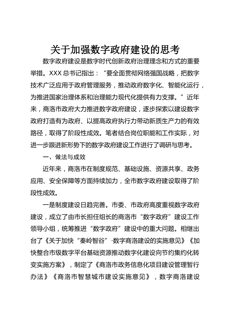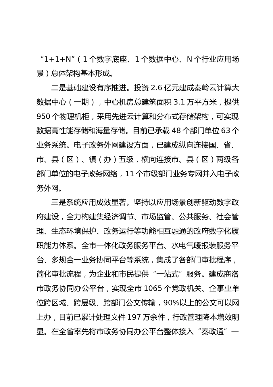 關于加強數(shù)字政府建設的思考數(shù)字政府建設是數(shù)字時代創(chuàng)新政府治理理念和方式的重要舉措。XXX總書記指出:“要全面貫徹網(wǎng)絡強國戰(zhàn)略,把數(shù)字技術廣泛應用于政府管理服務,推動政府數(shù)字化、智能化運行,為推進國家治理體系和治理能力現(xiàn)代化提供有力支撐?!苯陙?,商洛市政府大力推進數(shù)字政府建設,逐步探索以建設數(shù)字政府打造有為政府、以提高政府執(zhí)行力帶動新質(zhì)生產(chǎn)力的有效路徑,取得了階段性成效。筆者結(jié)合崗位職能和工作實際,對進一步跟進新形勢下的數(shù)字政府建設工作進行了調(diào)研與思考。一、做法與成效近年來,商洛市在制度規(guī)范、基礎設施、資源共享、政務應用、安全...