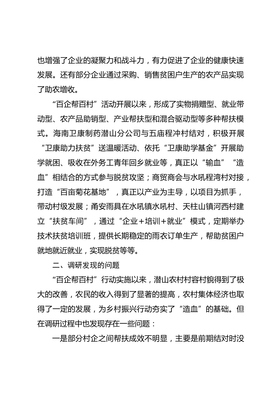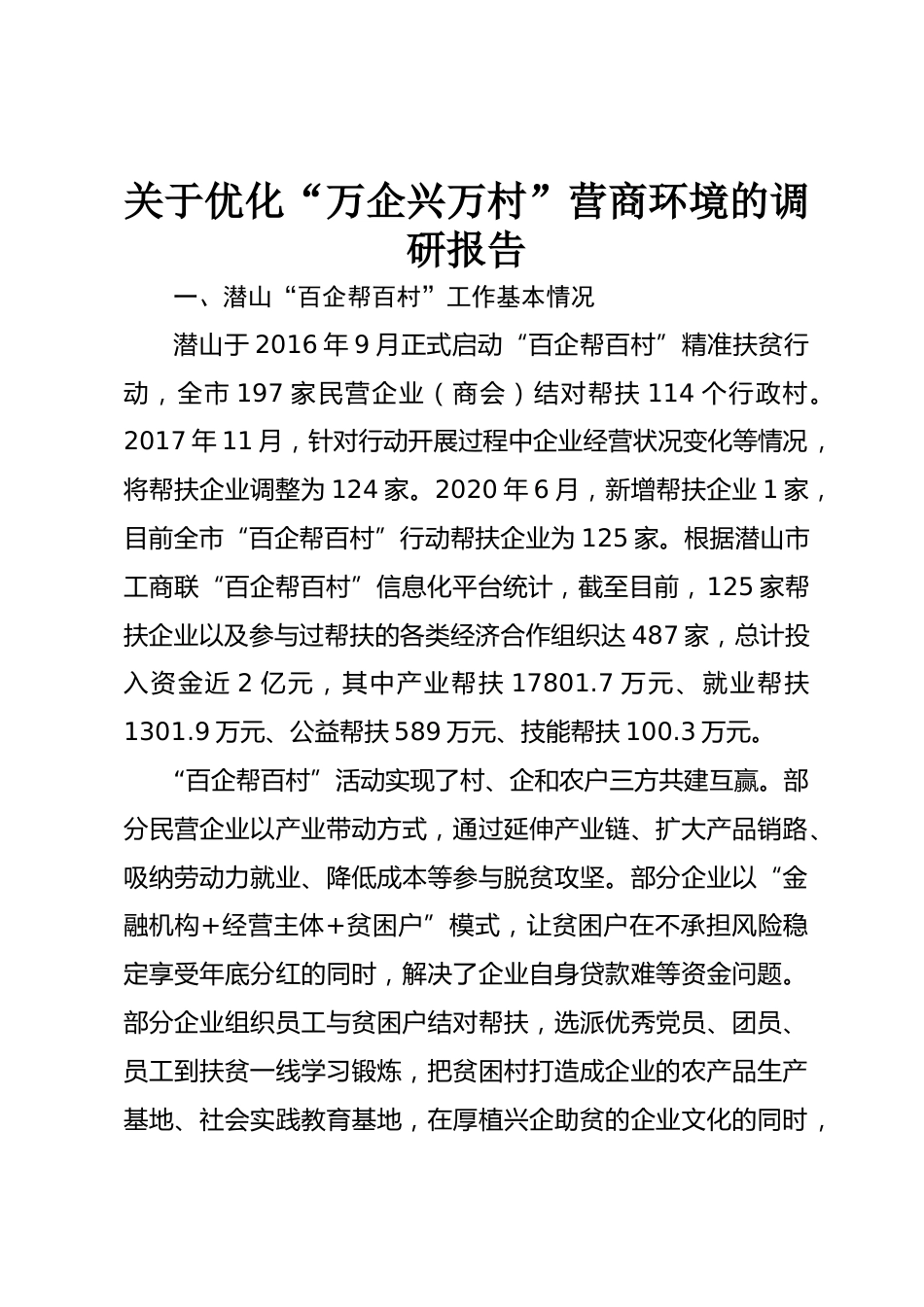 關(guān)于優(yōu)化“萬企興萬村”營(yíng)商環(huán)境的調(diào)研報(bào)告一、潛山“百企幫百村”工作基本情況潛山于2016年9月正式啟動(dòng)“百企幫百村”精準(zhǔn)扶貧行動(dòng),全市197家民營(yíng)企業(yè)(商會(huì))結(jié)對(duì)幫扶114個(gè)行政村。2017年11月,針對(duì)行動(dòng)開展過程中企業(yè)經(jīng)營(yíng)狀況變化等情況,將幫扶企業(yè)調(diào)整為124家。2020年6月,新增幫扶企業(yè)1家,目前全市“百企幫百村”行動(dòng)幫扶企業(yè)為125家。根據(jù)潛山市工商聯(lián)“百企幫百村”信息化平臺(tái)統(tǒng)計(jì),截至目前,125家?guī)头銎髽I(yè)以及參與過幫扶的各類經(jīng)濟(jì)合作組織達(dá)487家,總計(jì)投入資金近2億元,其中產(chǎn)業(yè)幫扶17801.7萬元、就業(yè)幫扶1301.9萬元、公益幫扶589萬元、技能幫扶100.3萬元...
