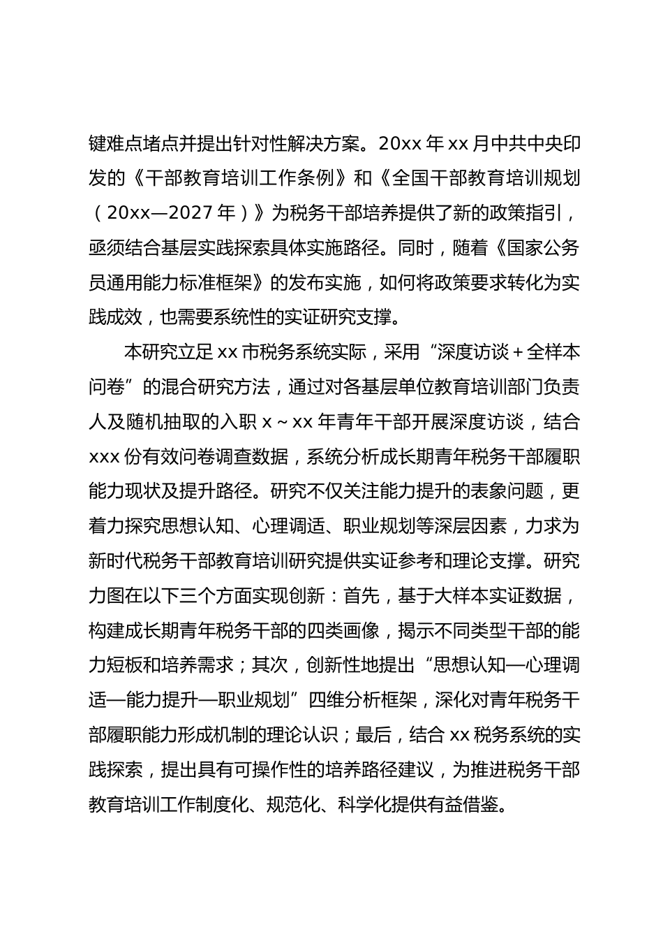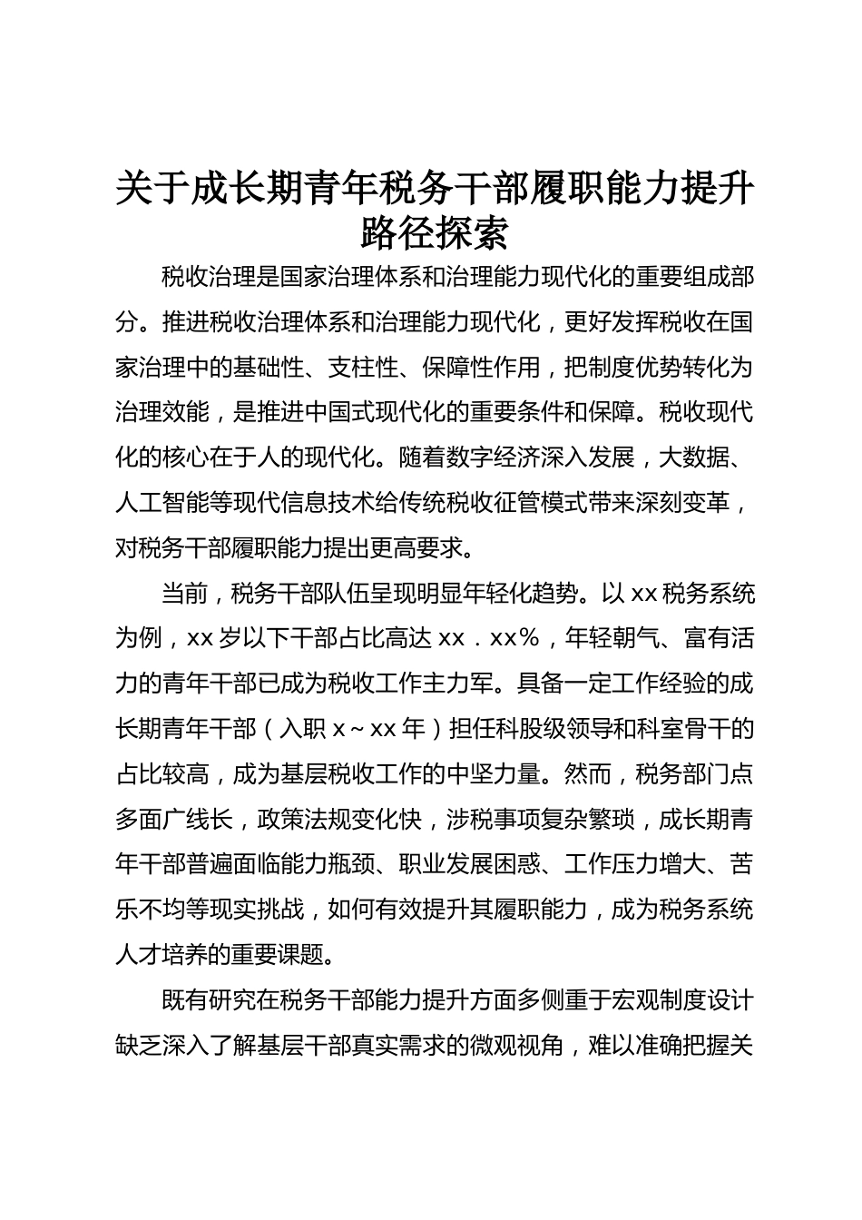 關于成長期青年稅務干部履職能力提升路徑探索稅收治理是國家治理體系和治理能力現(xiàn)代化的重要組成部分。推進稅收治理體系和治理能力現(xiàn)代化,更好發(fā)揮稅收在國家治理中的基礎性、支柱性、保障性作用,把制度優(yōu)勢轉化為治理效能,是推進中國式現(xiàn)代化的重要條件和保障。稅收現(xiàn)代化的核心在于人的現(xiàn)代化。隨著數(shù)字經(jīng)濟深入發(fā)展,大數(shù)據(jù)、人工智能等現(xiàn)代信息技術給傳統(tǒng)稅收征管模式帶來深刻變革,對稅務干部履職能力提出更高要求。當前,稅務干部隊伍呈現(xiàn)明顯年輕化趨勢。以xx稅務系統(tǒng)為例,xx歲以下干部占比高達xx.xx%,年輕朝氣、富有活力的青年干部已成為稅收工作主力軍。...
