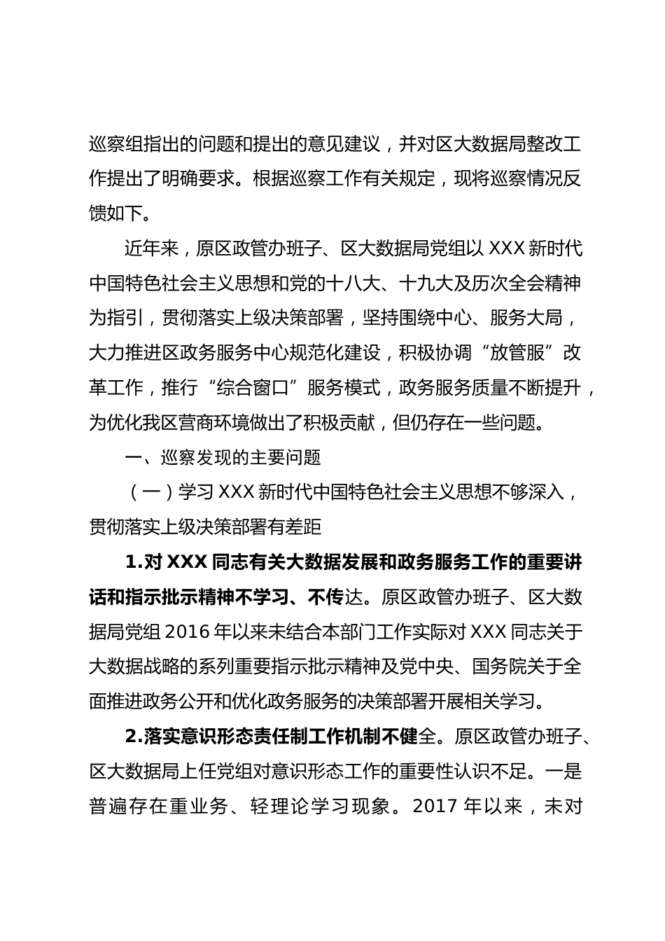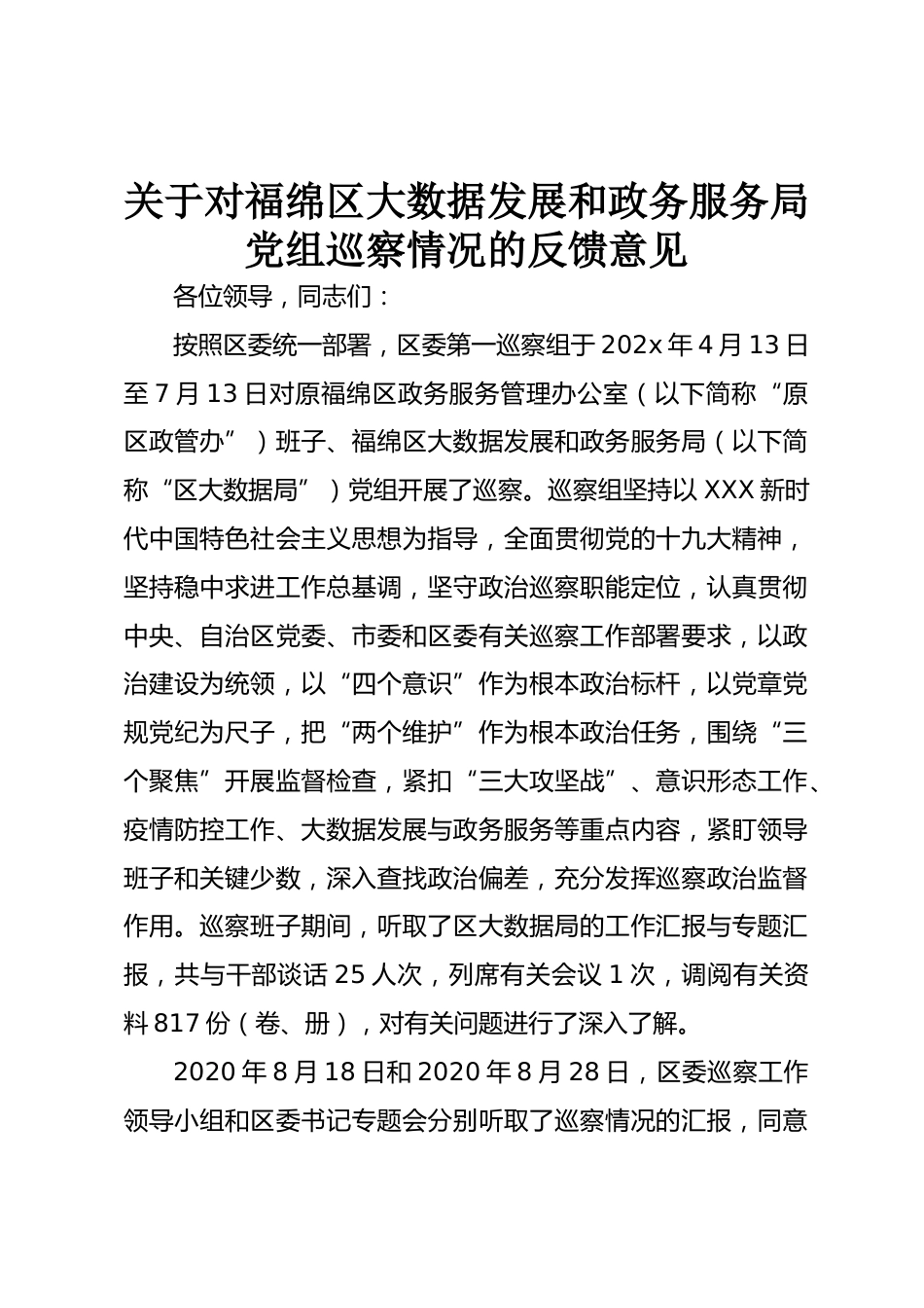 關(guān)于對(duì)福綿區(qū)大數(shù)據(jù)發(fā)展和政務(wù)服務(wù)局黨組巡察情況的反饋意見各位領(lǐng)導(dǎo),同志們:按照區(qū)委統(tǒng)一部署,區(qū)委第一巡察組于202x年4月13日至7月13日對(duì)原福綿區(qū)政務(wù)服務(wù)管理辦公室(以下簡(jiǎn)稱“原區(qū)政管辦”)班子、福綿區(qū)大數(shù)據(jù)發(fā)展和政務(wù)服務(wù)局(以下簡(jiǎn)稱“區(qū)大數(shù)據(jù)局”)黨組開展了巡察。巡察組堅(jiān)持以XXX新時(shí)代中國(guó)特色社會(huì)主義思想為指導(dǎo),全面貫徹黨的十九大精神,堅(jiān)持穩(wěn)中求進(jìn)工作總基調(diào),堅(jiān)守政治巡察職能定位,認(rèn)真貫徹中央、自治區(qū)黨委、市委和區(qū)委有關(guān)巡察工作部署要求,以政治建設(shè)為統(tǒng)領(lǐng),以“四個(gè)意識(shí)”作為根本政治標(biāo)桿,以黨章黨規(guī)黨紀(jì)為尺子,把“兩個(gè)維護(hù)”作為根...