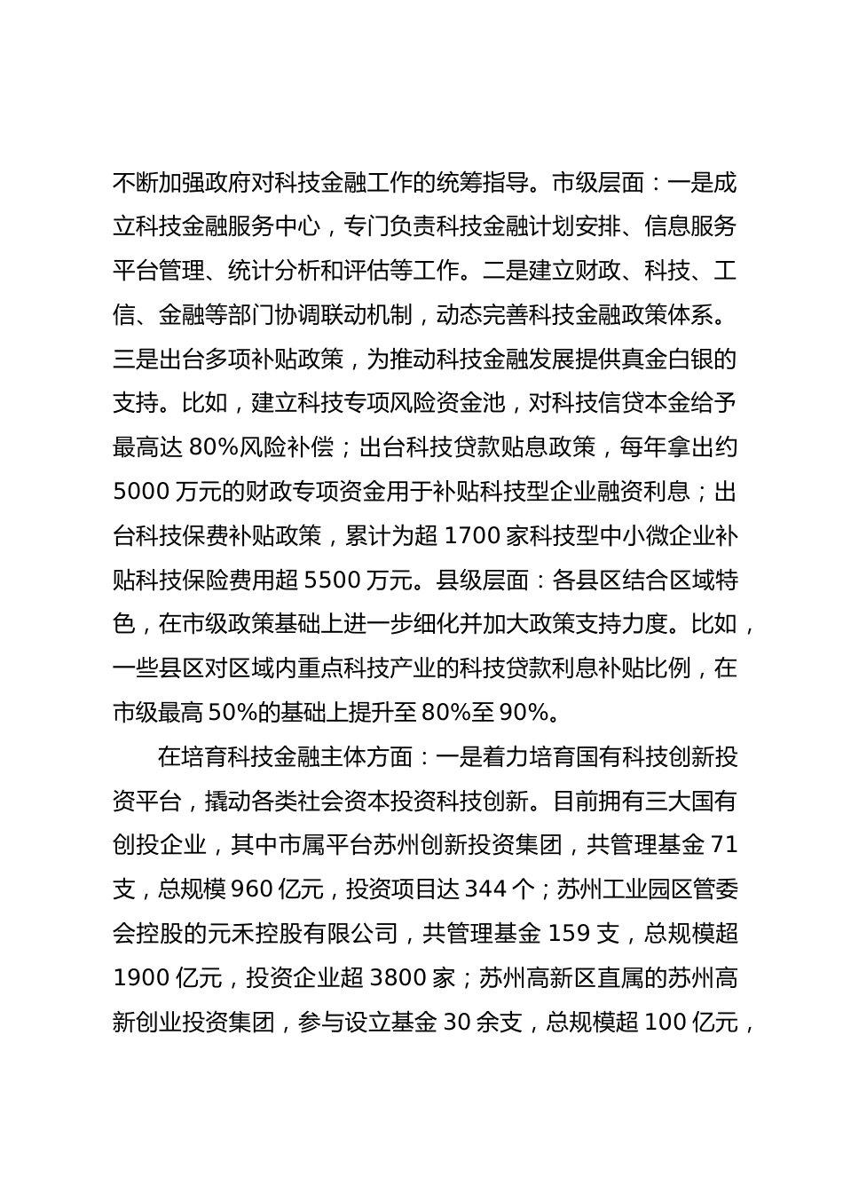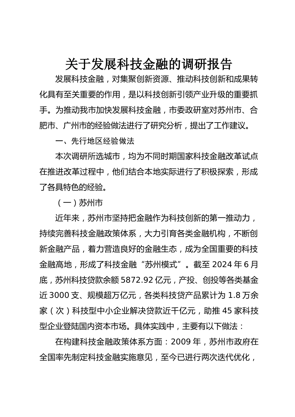 關(guān)于發(fā)展科技金融的調(diào)研報告發(fā)展科技金融,對集聚創(chuàng)新資源、推動科技創(chuàng)新和成果轉(zhuǎn)化具有至關(guān)重要的作用,是以科技創(chuàng)新引領(lǐng)產(chǎn)業(yè)升級的重要抓手。為推動我市加快發(fā)展科技金融,市委政研室對蘇州市、合肥市、廣州市的經(jīng)驗做法進行了研究分析,提出了工作建議。一、先行地區(qū)經(jīng)驗做法本次調(diào)研所選城市,均為不同時期國家科技金融改革試點在推進改革過程中,他們結(jié)合本地實際進行了積極探索,形成了各具特色的經(jīng)驗。(一)蘇州市近年來,蘇州市堅持把金融作為科技創(chuàng)新的第一推動力,持續(xù)完善科技金融政策體系,大力引育各類金融機構(gòu),不斷創(chuàng)新金融產(chǎn)品,著力營造良好的金融生態(tài)...