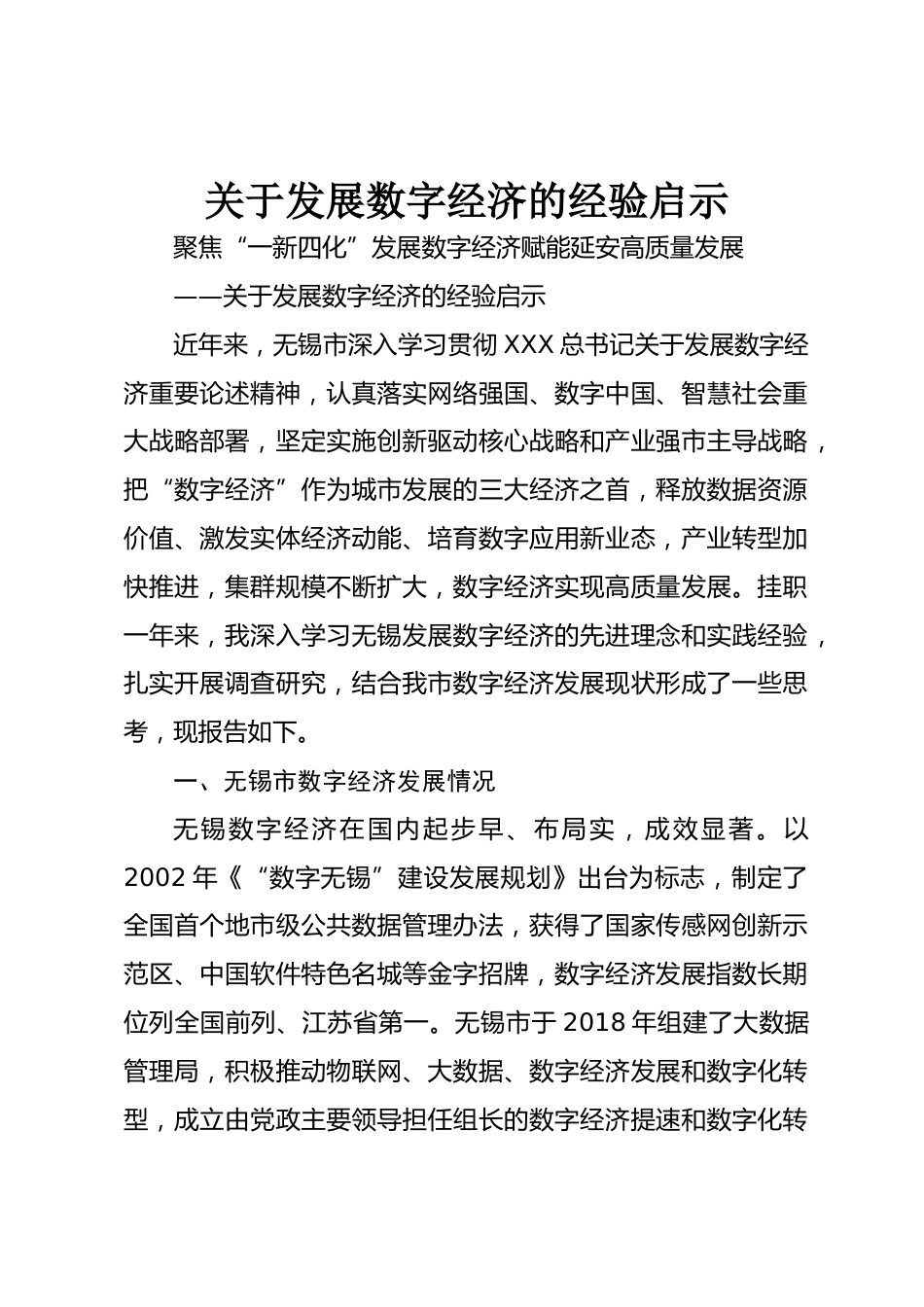關(guān)于發(fā)展數(shù)字經(jīng)濟(jì)的經(jīng)驗(yàn)啟示聚焦“一新四化”發(fā)展數(shù)字經(jīng)濟(jì)賦能延安高質(zhì)量發(fā)展——關(guān)于發(fā)展數(shù)字經(jīng)濟(jì)的經(jīng)驗(yàn)啟示近年來(lái),無(wú)錫市深入學(xué)習(xí)貫徹XXX總書記關(guān)于發(fā)展數(shù)字經(jīng)濟(jì)重要論述精神,認(rèn)真落實(shí)網(wǎng)絡(luò)強(qiáng)國(guó)、數(shù)字中國(guó)、智慧社會(huì)重大戰(zhàn)略部署,堅(jiān)定實(shí)施創(chuàng)新驅(qū)動(dòng)核心戰(zhàn)略和產(chǎn)業(yè)強(qiáng)市主導(dǎo)戰(zhàn)略,把“數(shù)字經(jīng)濟(jì)”作為城市發(fā)展的三大經(jīng)濟(jì)之首,釋放數(shù)據(jù)資源價(jià)值、激發(fā)實(shí)體經(jīng)濟(jì)動(dòng)能、培育數(shù)字應(yīng)用新業(yè)態(tài),產(chǎn)業(yè)轉(zhuǎn)型加快推進(jìn),集群規(guī)模不斷擴(kuò)大,數(shù)字經(jīng)濟(jì)實(shí)現(xiàn)高質(zhì)量發(fā)展。掛職一年來(lái),我深入學(xué)習(xí)無(wú)錫發(fā)展數(shù)字經(jīng)濟(jì)的先進(jìn)理念和實(shí)踐經(jīng)驗(yàn),扎實(shí)開(kāi)展調(diào)查研究,結(jié)合我市數(shù)字經(jīng)濟(jì)發(fā)展現(xiàn)狀形成了一...