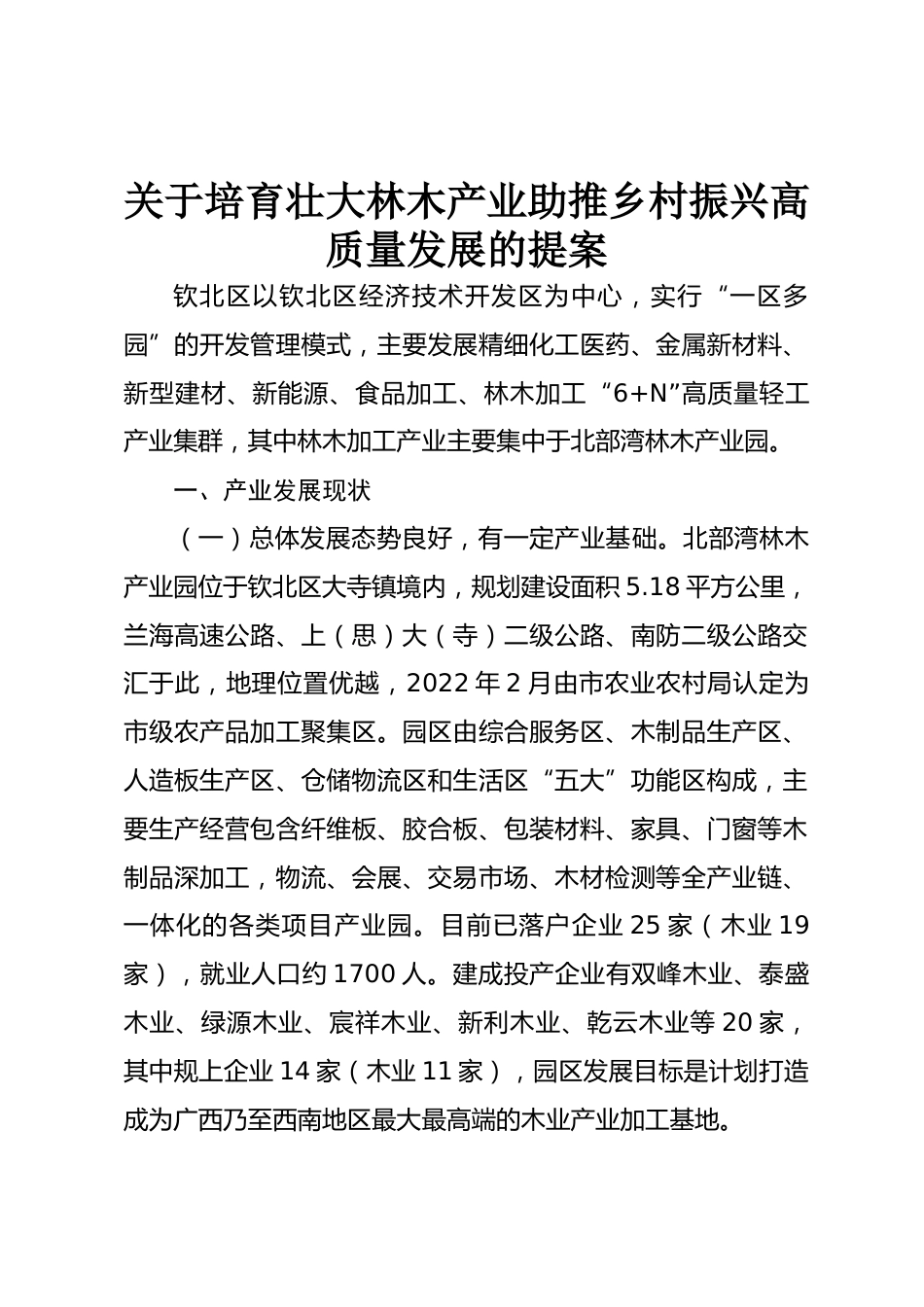 關(guān)于培育壯大林木產(chǎn)業(yè)助推鄉(xiāng)村振興高質(zhì)量發(fā)展的提案欽北區(qū)以欽北區(qū)經(jīng)濟(jì)技術(shù)開(kāi)發(fā)區(qū)為中心,實(shí)行“一區(qū)多園”的開(kāi)發(fā)管理模式,主要發(fā)展精細(xì)化工醫(yī)藥、金屬新材料、新型建材、新能源、食品加工、林木加工“6+N”高質(zhì)量輕工產(chǎn)業(yè)集群,其中林木加工產(chǎn)業(yè)主要集中于北部灣林木產(chǎn)業(yè)園。一、產(chǎn)業(yè)發(fā)展現(xiàn)狀(一)總體發(fā)展態(tài)勢(shì)良好,有一定產(chǎn)業(yè)基礎(chǔ)。北部灣林木產(chǎn)業(yè)園位于欽北區(qū)大寺鎮(zhèn)境內(nèi),規(guī)劃建設(shè)面積5.18平方公里,蘭海高速公路、上(思)大(寺)二級(jí)公路、南防二級(jí)公路交匯于此,地理位置優(yōu)越,2022年2月由市農(nóng)業(yè)農(nóng)村局認(rèn)定為市級(jí)農(nóng)產(chǎn)品加工聚集區(qū)。園區(qū)由綜合服務(wù)區(qū)、木制品生...