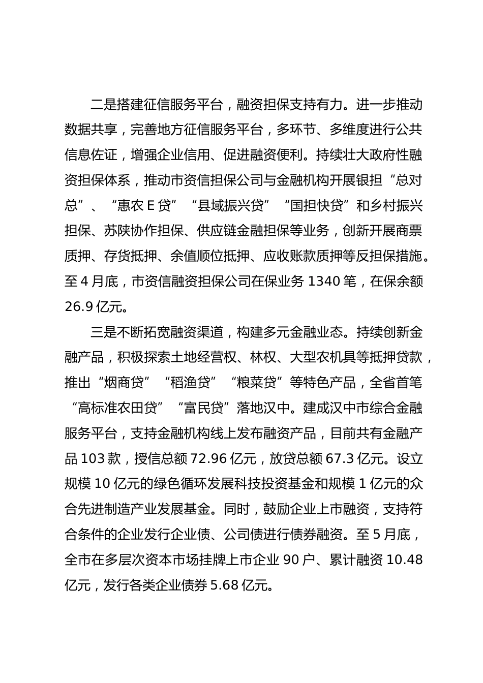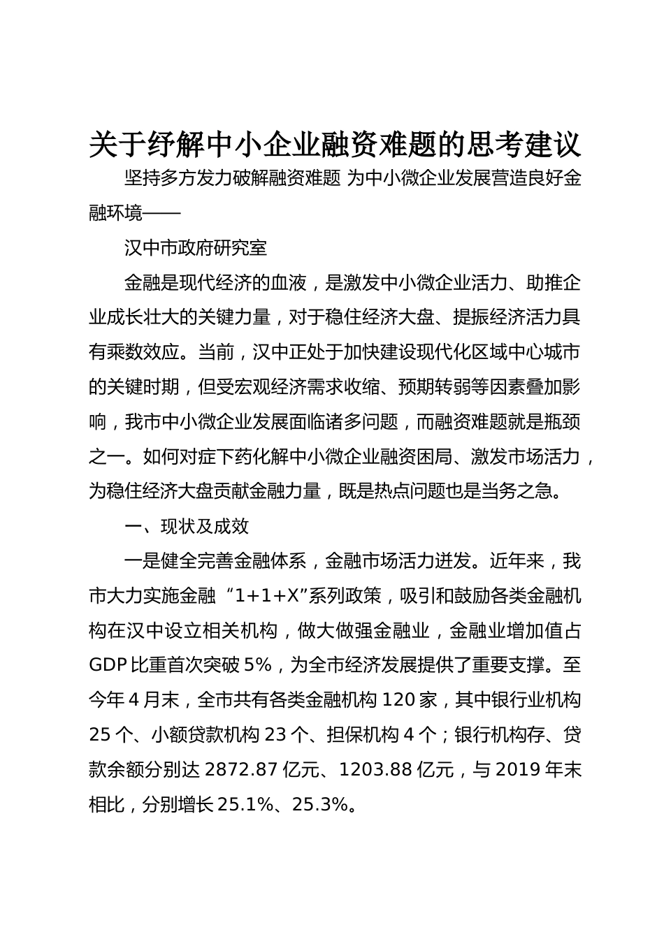 關(guān)于紓解中小企業(yè)融資難題的思考建議堅(jiān)持多方發(fā)力破解融資難題為中小微企業(yè)發(fā)展?fàn)I造良好金融環(huán)境——漢中市政府研究室金融是現(xiàn)代經(jīng)濟(jì)的血液,是激發(fā)中小微企業(yè)活力、助推企業(yè)成長(zhǎng)壯大的關(guān)鍵力量,對(duì)于穩(wěn)住經(jīng)濟(jì)大盤、提振經(jīng)濟(jì)活力具有乘數(shù)效應(yīng)。當(dāng)前,漢中正處于加快建設(shè)現(xiàn)代化區(qū)域中心城市的關(guān)鍵時(shí)期,但受宏觀經(jīng)濟(jì)需求收縮、預(yù)期轉(zhuǎn)弱等因素疊加影響,我市中小微企業(yè)發(fā)展面臨諸多問(wèn)題,而融資難題就是瓶頸之一。如何對(duì)癥下藥化解中小微企業(yè)融資困局、激發(fā)市場(chǎng)活力,為穩(wěn)住經(jīng)濟(jì)大盤貢獻(xiàn)金融力量,既是熱點(diǎn)問(wèn)題也是當(dāng)務(wù)之急。一、現(xiàn)狀及成效一是健全完善金融體系,金融市場(chǎng)...