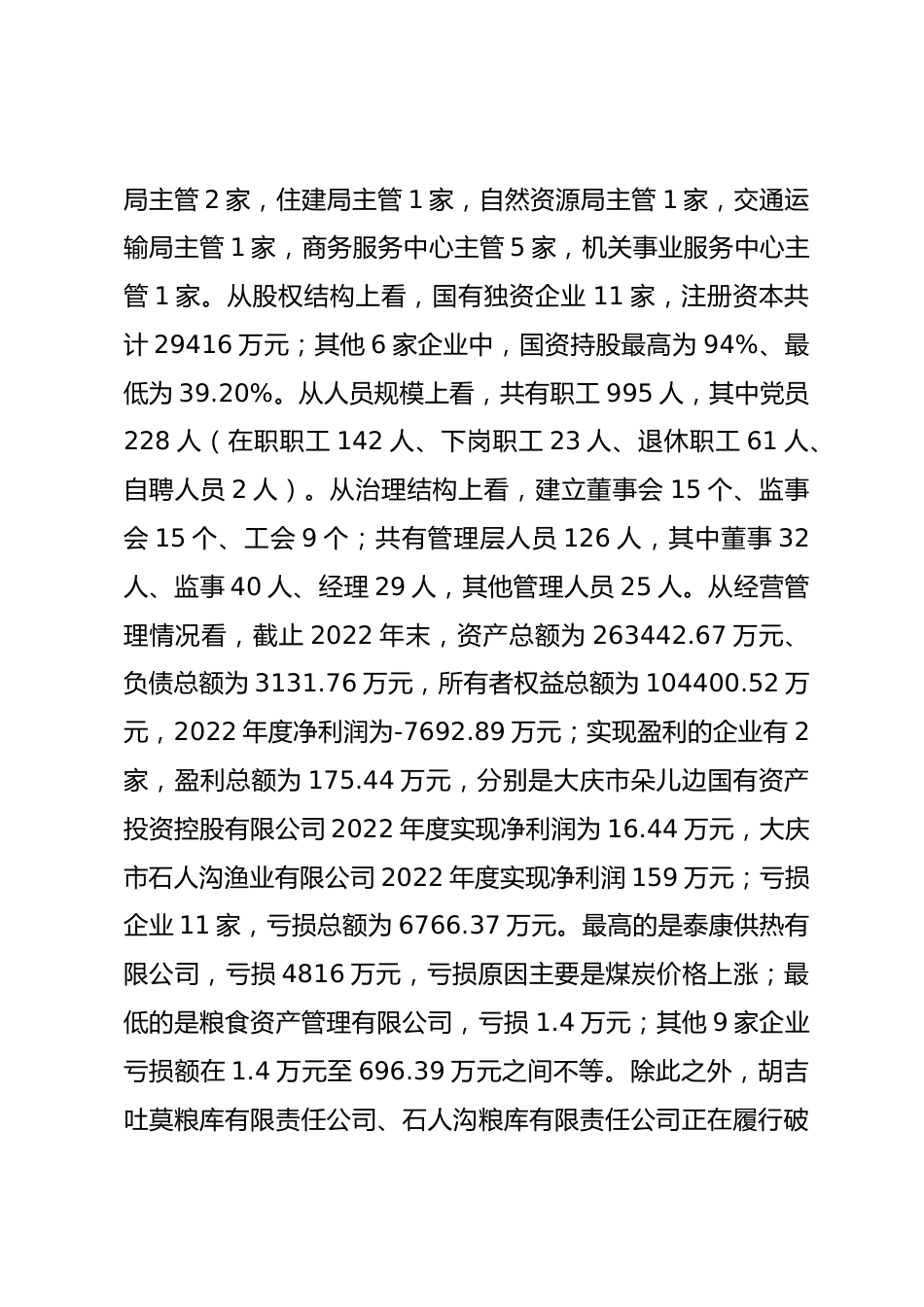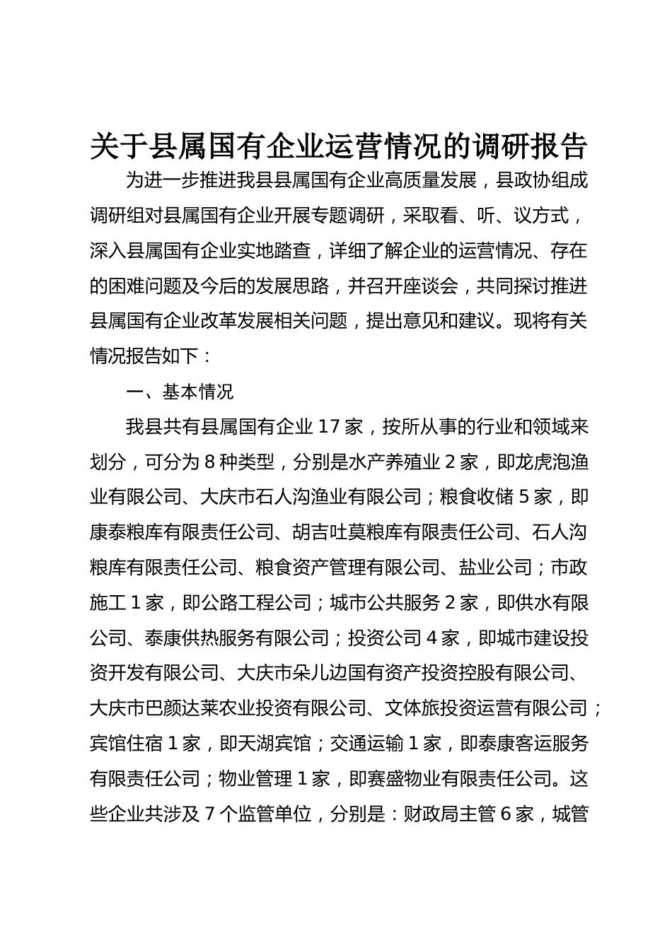 關(guān)于縣屬國有企業(yè)運(yùn)營情況的調(diào)研報告為進(jìn)一步推進(jìn)我縣縣屬國有企業(yè)高質(zhì)量發(fā)展,縣政協(xié)組成調(diào)研組對縣屬國有企業(yè)開展專題調(diào)研,采取看、聽、議方式,深入縣屬國有企業(yè)實(shí)地踏查,詳細(xì)了解企業(yè)的運(yùn)營情況、存在的困難問題及今后的發(fā)展思路,并召開座談會,共同探討推進(jìn)縣屬國有企業(yè)改革發(fā)展相關(guān)問題,提出意見和建議?,F(xiàn)將有關(guān)情況報告如下:一、基本情況我縣共有縣屬國有企業(yè)17家,按所從事的行業(yè)和領(lǐng)域來劃分,可分為8種類型,分別是水產(chǎn)養(yǎng)殖業(yè)2家,即龍虎泡漁業(yè)有限公司、大慶市石人溝漁業(yè)有限公司;糧食收儲5家,即康泰糧庫有限責(zé)任公司、胡吉吐莫糧庫有限責(zé)任公司、石...