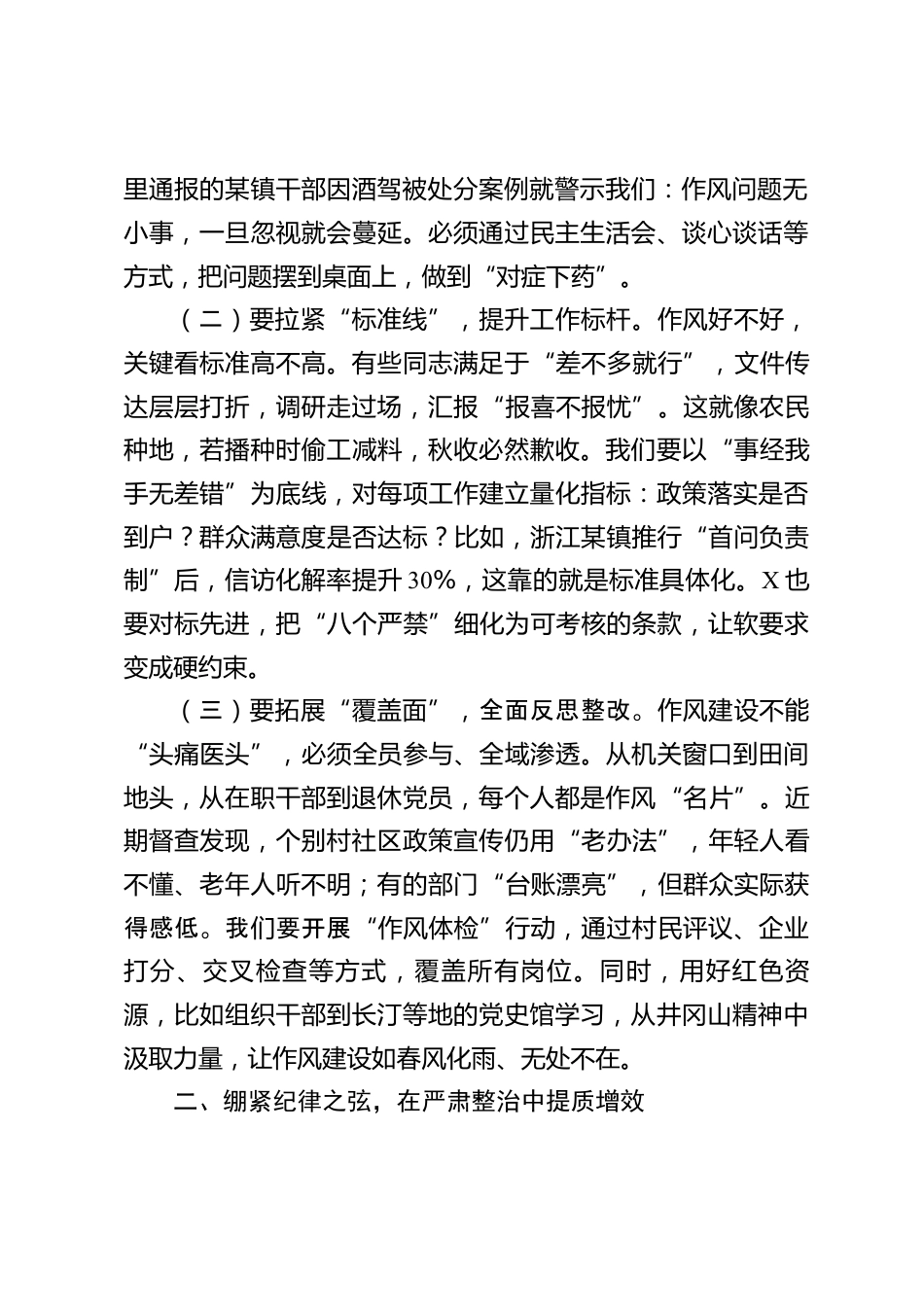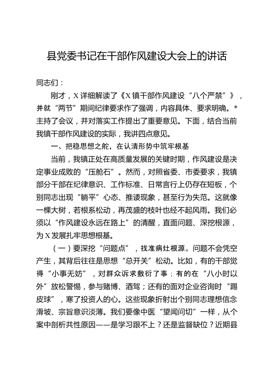 縣黨委書記在干部作風(fēng)建設(shè)大會上的講話同志們:剛才,X詳細解讀了《X鎮(zhèn)干部作風(fēng)建設(shè)“八個嚴禁”》,并就“兩節(jié)”期間紀(jì)律要求作了強調(diào),內(nèi)容具體、要求明確。*主持了會議,并對落實工作提出了重要意見。下面,結(jié)合當(dāng)前我鎮(zhèn)干部作風(fēng)建設(shè)的實際,我講四點意見。一、把穩(wěn)思想之舵,在認清形勢中筑牢根基當(dāng)前,我鎮(zhèn)正處在高質(zhì)量發(fā)展的關(guān)鍵時期,作風(fēng)建設(shè)是決定事業(yè)成敗的“壓艙石”。然而,對照省委、市委要求,我鎮(zhèn)部分干部在紀(jì)律意識、工作標(biāo)準(zhǔn)、日常言行上仍存在短板,個別同志出現(xiàn)“躺平”心態(tài)、推諉現(xiàn)象,甚至行為失范。這就像一棵大樹,若根系松動,再茂盛的枝葉也經(jīng)...