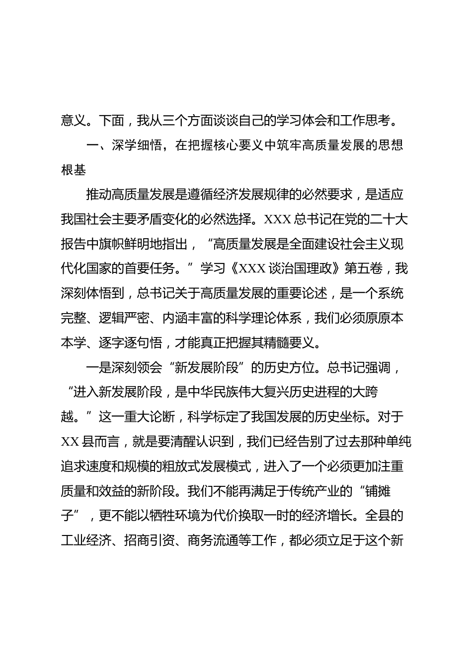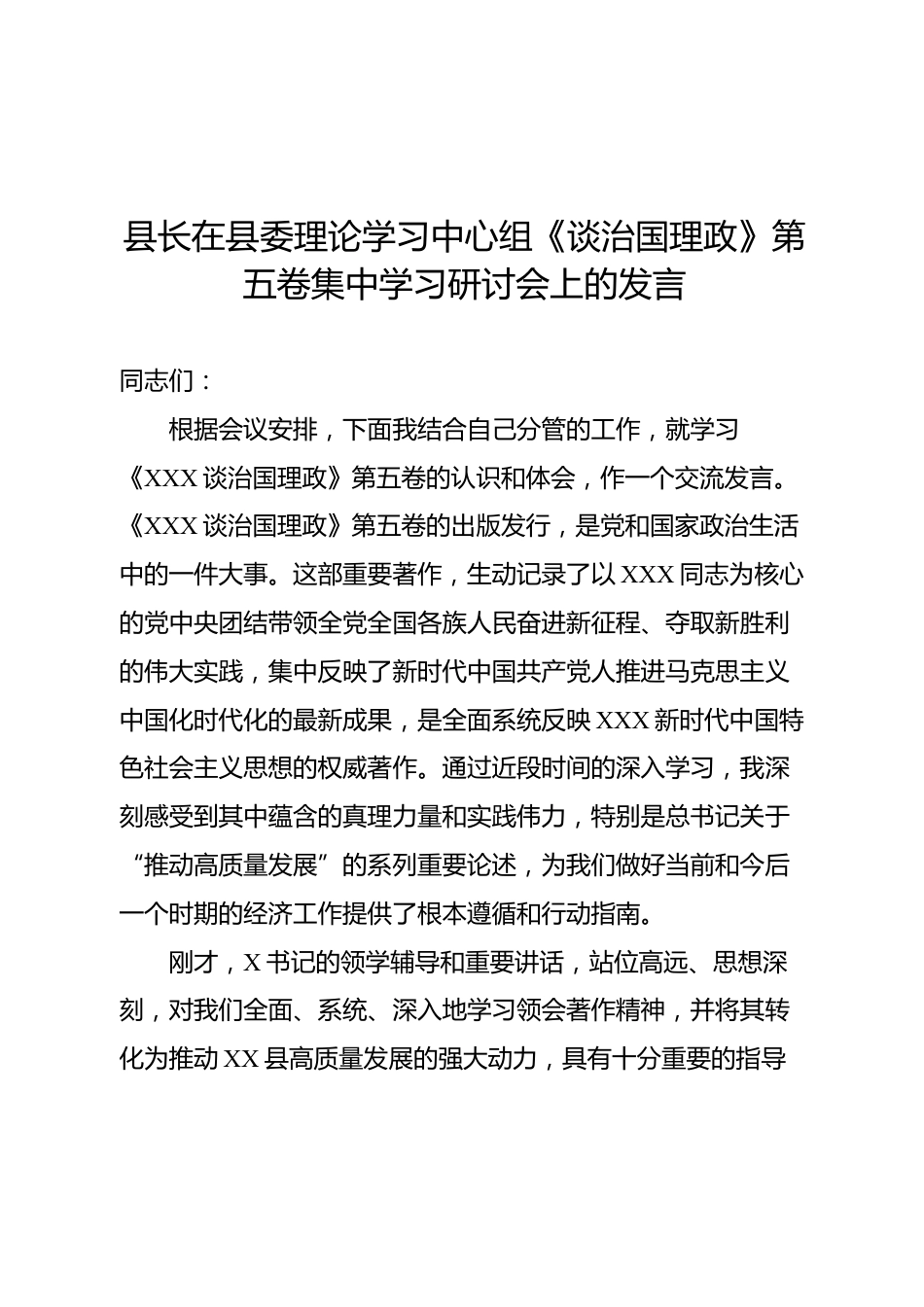 縣長(zhǎng)在縣委理論學(xué)習(xí)中心組《談治國(guó)理政》第五卷集中學(xué)習(xí)研討會(huì)上的發(fā)言同志們:根據(jù)會(huì)議安排,下面我結(jié)合自己分管的工作,就學(xué)習(xí)《XXX談治國(guó)理政》第五卷的認(rèn)識(shí)和體會(huì),作一個(gè)交流發(fā)言?!禭XX談治國(guó)理政》第五卷的出版發(fā)行,是黨和國(guó)家政治生活中的一件大事。這部重要著作,生動(dòng)記錄了以XXX同志為核心的黨中央團(tuán)結(jié)帶領(lǐng)全黨全國(guó)各族人民奮進(jìn)新征程、奪取新勝利的偉大實(shí)踐,集中反映了新時(shí)代中國(guó)共產(chǎn)黨人推進(jìn)馬克思主義中國(guó)化時(shí)代化的最新成果,是全面系統(tǒng)反映XXX新時(shí)代中國(guó)特色社會(huì)主義思想的權(quán)威著作。通過近段時(shí)間的深入學(xué)習(xí),我深刻感受到其中蘊(yùn)含的真理力量和實(shí)踐偉力...