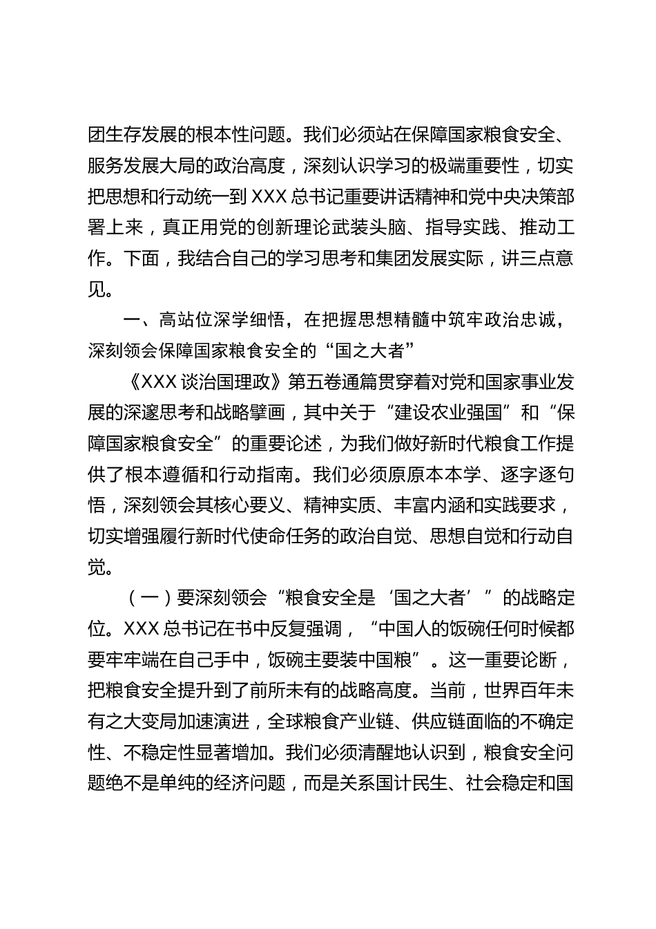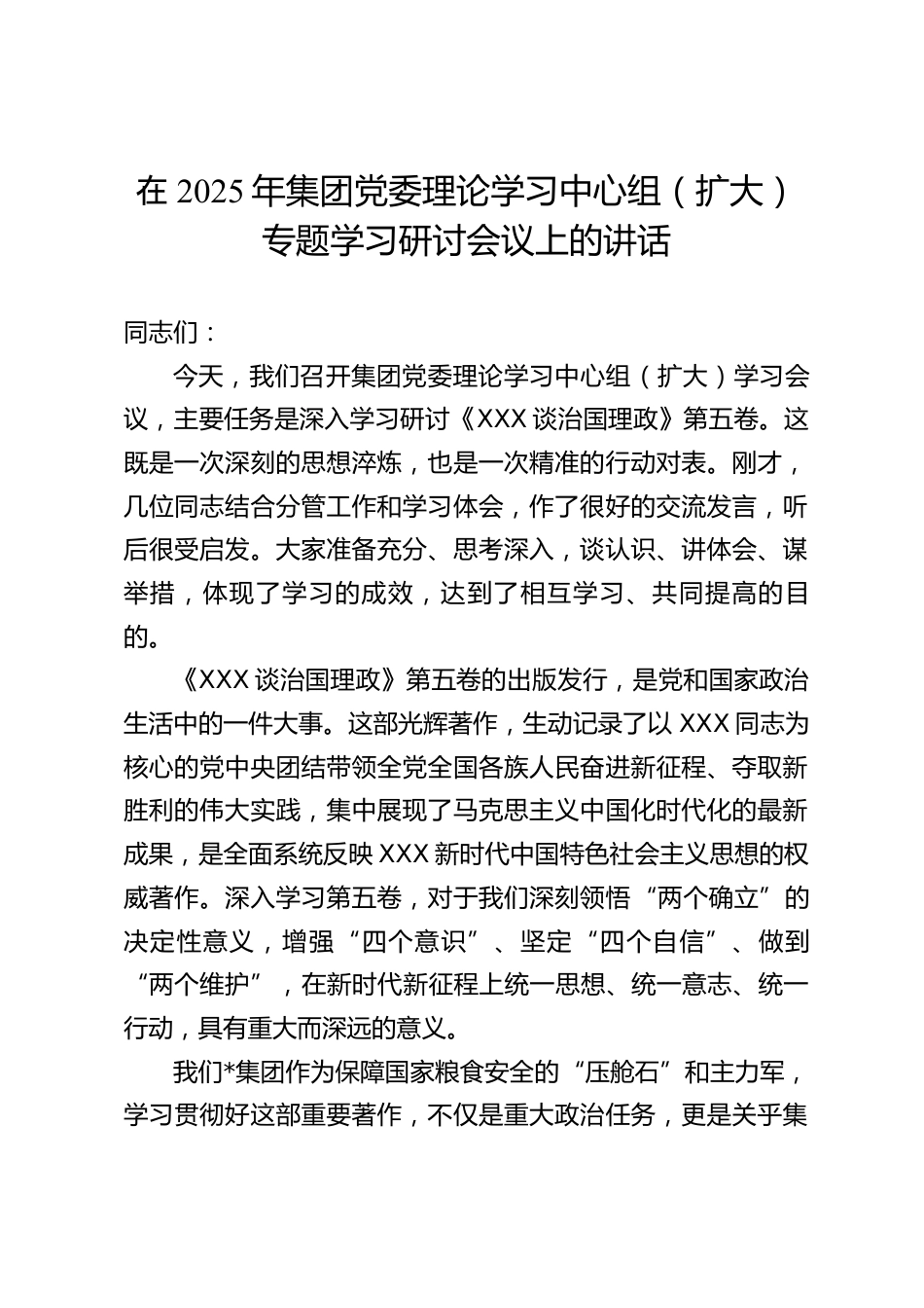 在2025年集團(tuán)黨委理論學(xué)習(xí)中心組(擴(kuò)大)專題學(xué)習(xí)研討會(huì)議上的講話同志們:今天,我們召開(kāi)集團(tuán)黨委理論學(xué)習(xí)中心組(擴(kuò)大)學(xué)習(xí)會(huì)議,主要任務(wù)是深入學(xué)習(xí)研討《XXX談治國(guó)理政》第五卷。這既是一次深刻的思想淬煉,也是一次精準(zhǔn)的行動(dòng)對(duì)表。剛才,幾位同志結(jié)合分管工作和學(xué)習(xí)體會(huì),作了很好的交流發(fā)言,聽(tīng)后很受啟發(fā)。大家準(zhǔn)備充分、思考深入,談?wù)J識(shí)、講體會(huì)、謀舉措,體現(xiàn)了學(xué)習(xí)的成效,達(dá)到了相互學(xué)習(xí)、共同提高的目的?!禭XX談治國(guó)理政》第五卷的出版發(fā)行,是黨和國(guó)家政治生活中的一件大事。這部光輝著作,生動(dòng)記錄了以XXX同志為核心的黨中央團(tuán)結(jié)帶領(lǐng)全黨全國(guó)各族人民...