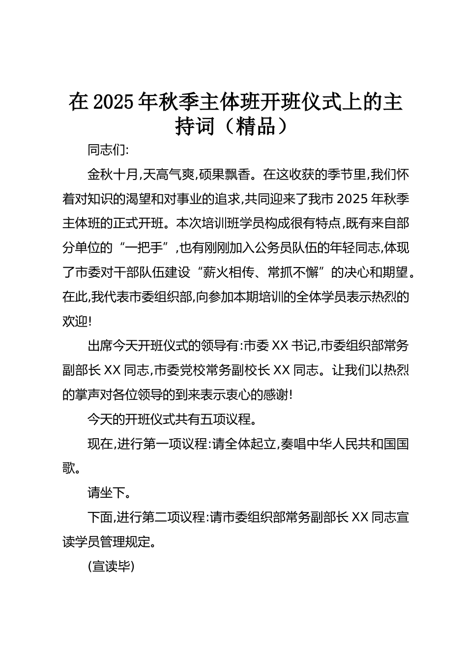 在2025年秋季主體班開班儀式上的主持詞(精品)