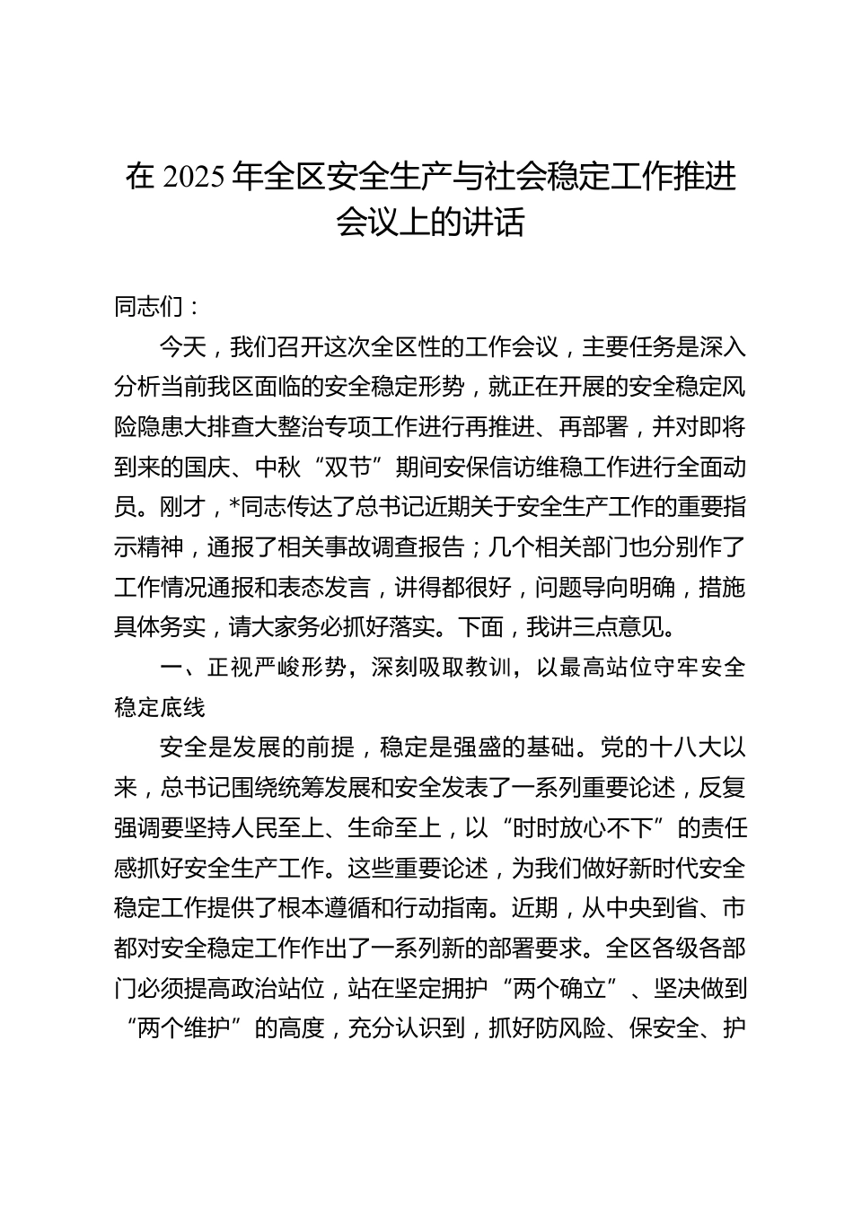在2025年全區(qū)安全生產(chǎn)與社會穩(wěn)定工作推進(jìn)會議上的講話