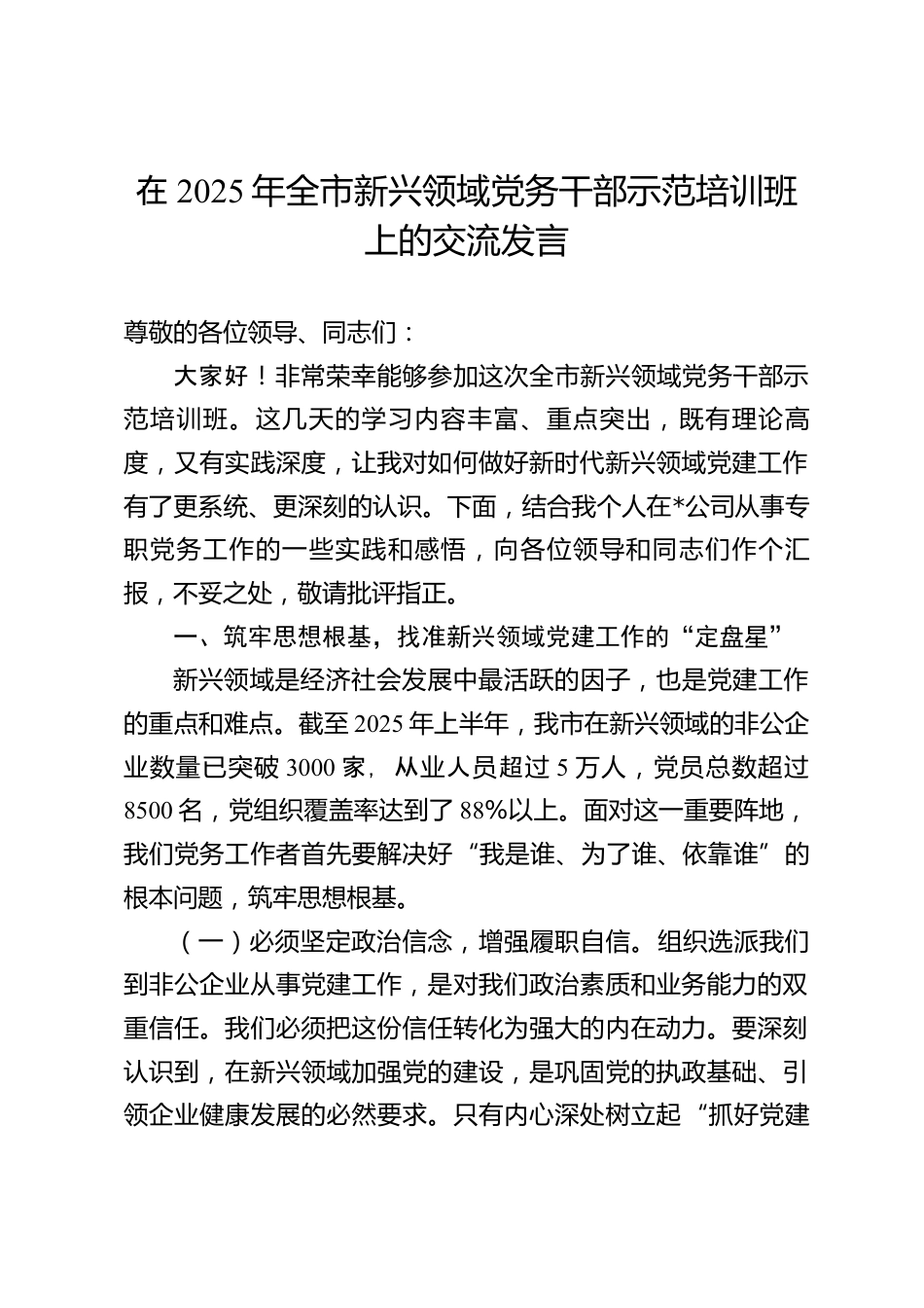 在2025年全市新興領(lǐng)域黨務(wù)干部示范培訓(xùn)班上的交流發(fā)言尊敬的各位領(lǐng)導(dǎo)、同志們:大家好!非常榮幸能夠參加這次全市新興領(lǐng)域黨務(wù)干部示范培訓(xùn)班。這幾天的學(xué)習(xí)內(nèi)容豐富、重點(diǎn)突出,既有理論高度,又有實(shí)踐深度,讓我對如何做好新時(shí)代新興領(lǐng)域黨建工作有了更系統(tǒng)、更深刻的認(rèn)識。下面,結(jié)合我個人在*公司從事專職黨務(wù)工作的一些實(shí)踐和感悟,向各位領(lǐng)導(dǎo)和同志們作個匯報(bào),不妥之處,敬請批評指正。一、筑牢思想根基,找準(zhǔn)新興領(lǐng)域黨建工作的“定盤星”新興領(lǐng)域是經(jīng)濟(jì)社會發(fā)展中最活躍的因子,也是黨建工作的重點(diǎn)和難點(diǎn)。截至2025年上半年,我市在新興領(lǐng)域的非公企業(yè)數(shù)量已突...