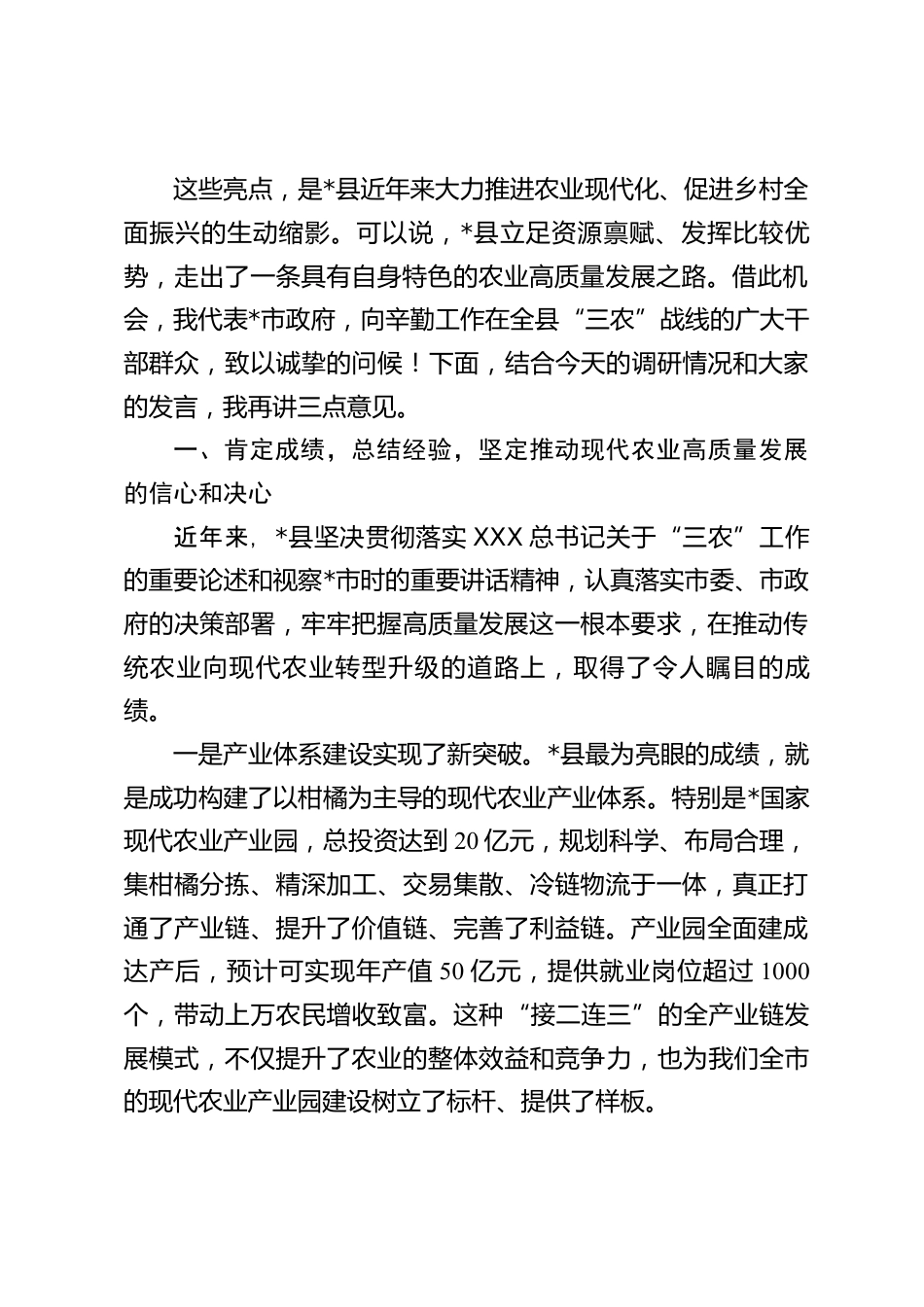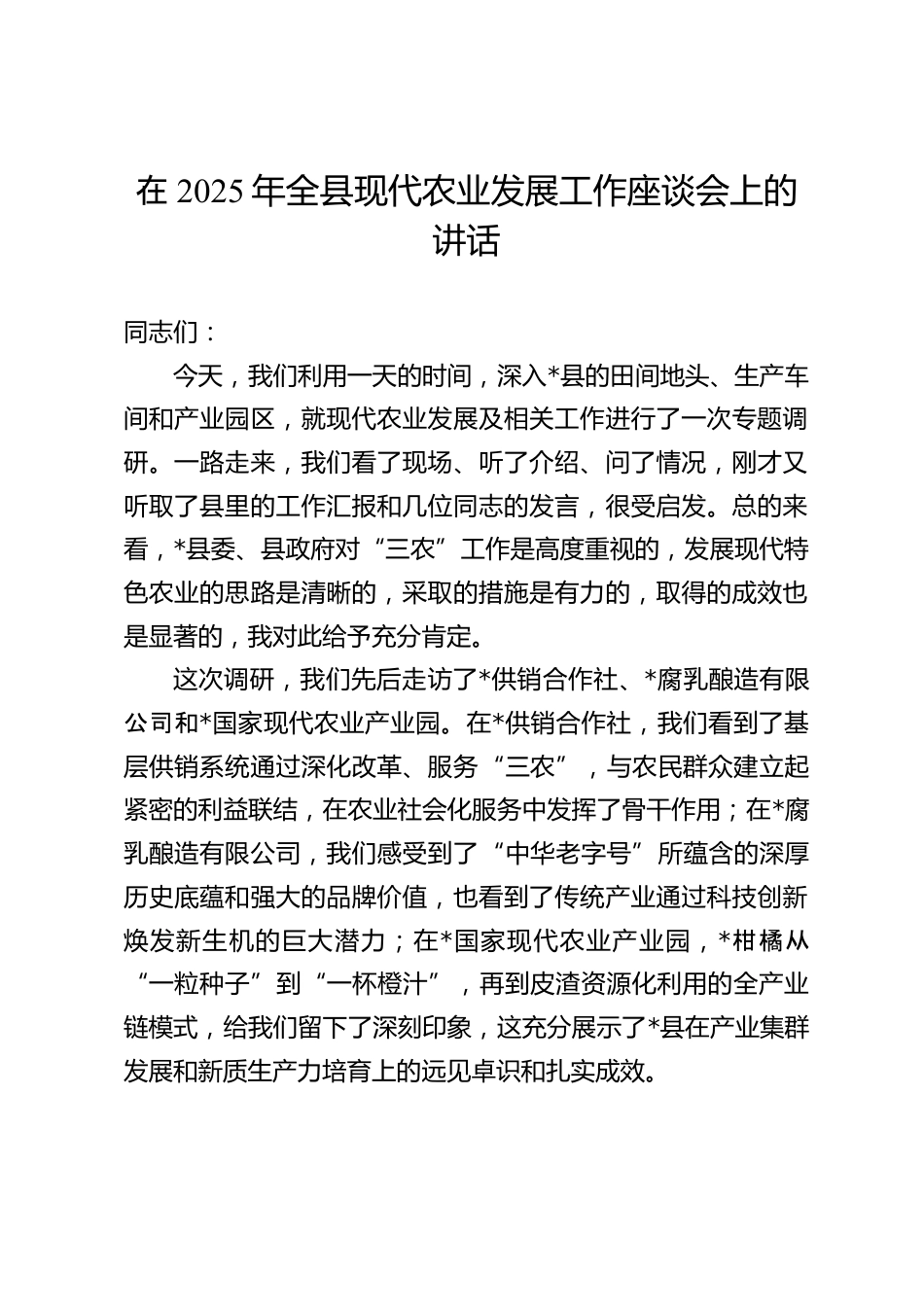 在2025年全縣現(xiàn)代農(nóng)業(yè)發(fā)展工作座談會上的講話同志們:今天,我們利用一天的時間,深入*縣的田間地頭、生產(chǎn)車間和產(chǎn)業(yè)園區(qū),就現(xiàn)代農(nóng)業(yè)發(fā)展及相關(guān)工作進(jìn)行了一次專題調(diào)研。一路走來,我們看了現(xiàn)場、聽了介紹、問了情況,剛才又聽取了縣里的工作匯報和幾位同志的發(fā)言,很受啟發(fā)??偟膩砜矗?縣委、縣政府對“三農(nóng)”工作是高度重視的,發(fā)展現(xiàn)代特色農(nóng)業(yè)的思路是清晰的,采取的措施是有力的,取得的成效也是顯著的,我對此給予充分肯定。這次調(diào)研,我們先后走訪了*供銷合作社、*腐乳釀造有限公司和*國家現(xiàn)代農(nóng)業(yè)產(chǎn)業(yè)園。在*供銷合作社,我們看到了基層供銷系統(tǒng)通過深化改革、...