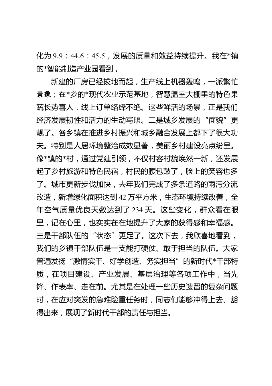 在2025年全縣鄉(xiāng)鎮(zhèn)工作調(diào)研座談會(huì)上的講話同志們:這次利用一段時(shí)間,我集中走遍了全縣所有鄉(xiāng)鎮(zhèn),深入到田間地頭、企業(yè)車間、項(xiàng)目一線,與我們的企業(yè)家、鄉(xiāng)村干部和黨員群眾進(jìn)行了深入的交流。今天,我們把各鄉(xiāng)鎮(zhèn)的負(fù)責(zé)同志召集起來,開這個(gè)座談會(huì),主要目的就是和大家一起,對(duì)調(diào)研中看到的情況、聽到的問題、想到的思路,進(jìn)行一次梳理和總結(jié),進(jìn)一步統(tǒng)一思想、凝聚共識(shí)、明確方向,奮力推動(dòng)黨中央、省委、市委各項(xiàng)決策部署在我們*縣一貫到底、落地落實(shí)。下面,我講幾點(diǎn)意見。一、肯定成績(jī)、正視差距,在客觀總結(jié)中堅(jiān)定發(fā)展信心通過這次調(diào)研,我總的感受是,近年來在全縣...