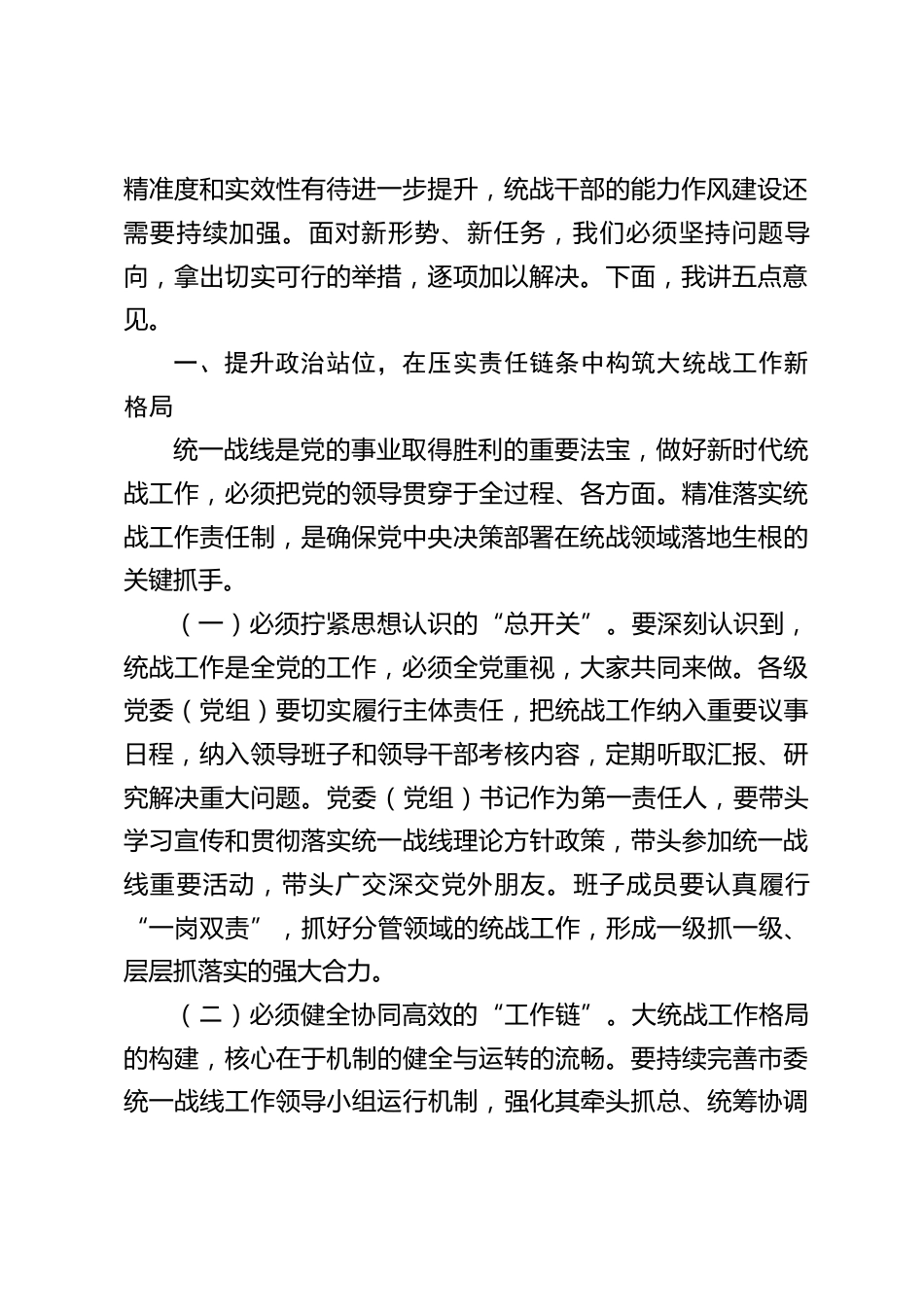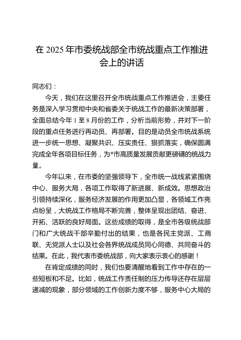 在2025年市委統(tǒng)戰(zhàn)部全市統(tǒng)戰(zhàn)重點工作推進會上的講話同志們:今天,我們在這里召開全市統(tǒng)戰(zhàn)重點工作推進會,主要任務(wù)是深入學(xué)習(xí)貫徹中央和省委關(guān)于統(tǒng)戰(zhàn)工作的最新決策部署,全面總結(jié)今年1至8月份的工作,分析當前形勢,并對下一階段的重點任務(wù)進行再動員、再部署。目的是動員全市統(tǒng)戰(zhàn)系統(tǒng)進一步統(tǒng)一思想、凝聚共識、壓實責(zé)任、狠抓落實,確保圓滿完成全年各項目標任務(wù),為*市高質(zhì)量發(fā)展貢獻更磅礴的統(tǒng)戰(zhàn)力量。今年以來,在市委的堅強領(lǐng)導(dǎo)下,全市統(tǒng)一戰(zhàn)線緊緊圍繞中心、服務(wù)大局,各項工作取得了新進展、新成效。思想政治引領(lǐng)持續(xù)深化,服務(wù)經(jīng)濟發(fā)展的作用更加凸顯,各領(lǐng)...