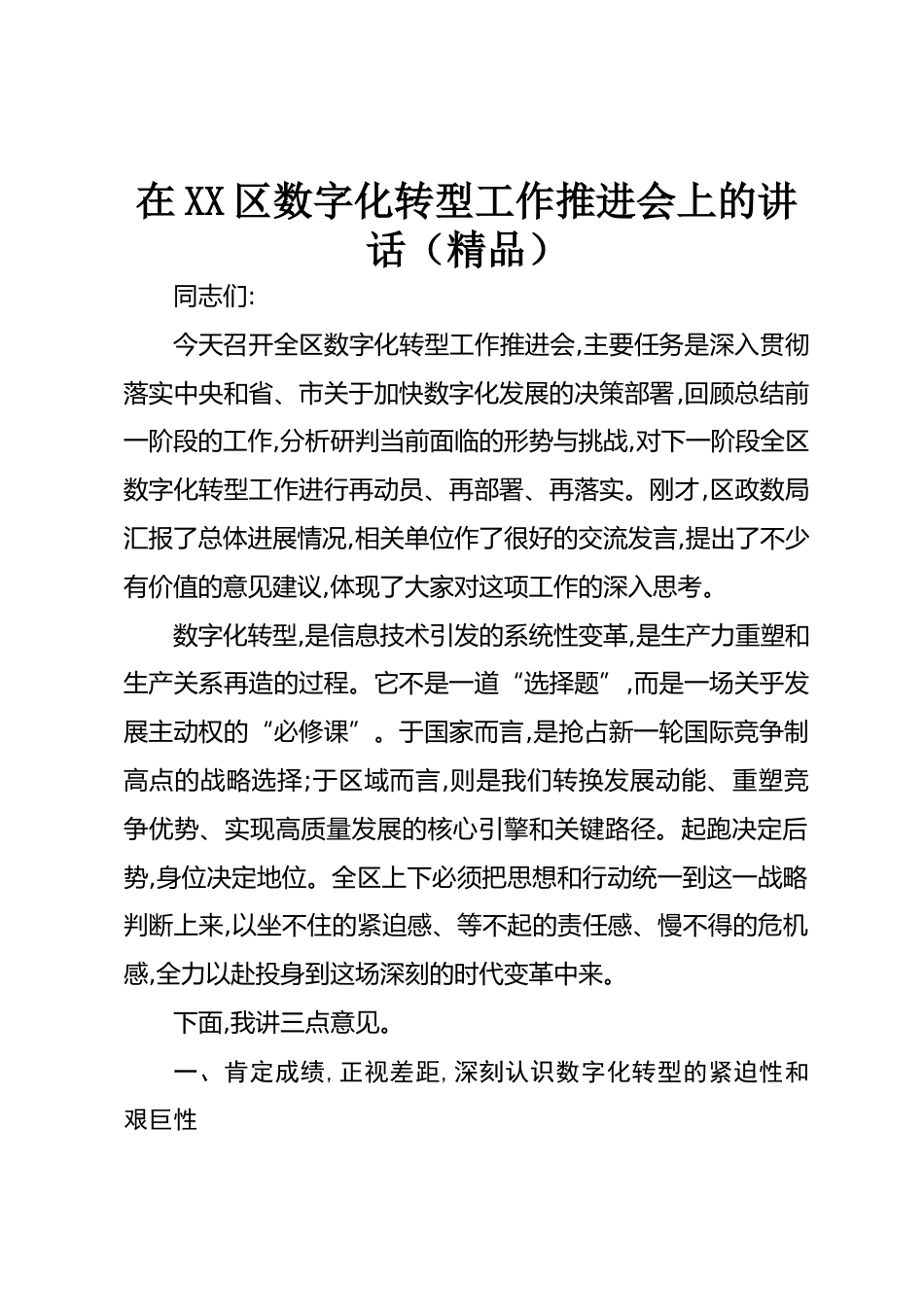 在XX區(qū)數(shù)字化轉(zhuǎn)型工作推進(jìn)會上的講話(精品)