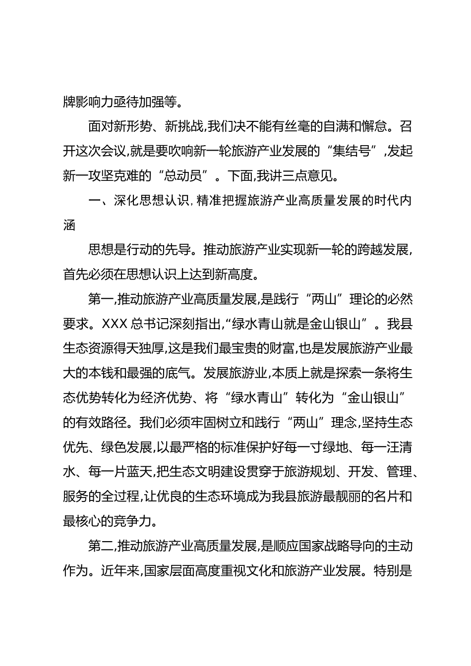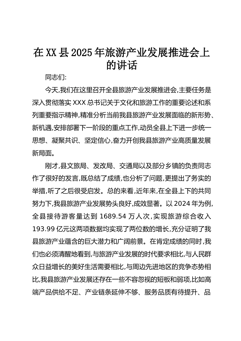 在XX縣2025年旅游產(chǎn)業(yè)發(fā)展推進(jìn)會(huì)上的講話同志們:今天,我們?cè)谶@里召開全縣旅游產(chǎn)業(yè)發(fā)展推進(jìn)會(huì),主要任務(wù)是深入貫徹落實(shí)XXX總書記關(guān)于文化和旅游工作的重要論述和系列重要指示精神,精準(zhǔn)分析當(dāng)前我縣旅游產(chǎn)業(yè)發(fā)展面臨的新形勢(shì)、新機(jī)遇,安排部署下一階段的重點(diǎn)工作,動(dòng)員全縣上下進(jìn)一步統(tǒng)一思想、凝聚共識(shí)、堅(jiān)定信心,奮力開創(chuàng)我縣旅游產(chǎn)業(yè)高質(zhì)量發(fā)展新局面。剛才,縣文旅局、發(fā)改局、交通局以及部分鄉(xiāng)鎮(zhèn)的負(fù)責(zé)同志作了很好的發(fā)言,既總結(jié)了成績(jī),也分析了問(wèn)題,更提出了務(wù)實(shí)的舉措,聽了之后很受啟發(fā)??偟膩?lái)看,近年來(lái),在全縣上下的共同努力下,我縣旅游產(chǎn)業(yè)發(fā)展勢(shì)頭良好,成效顯著。...