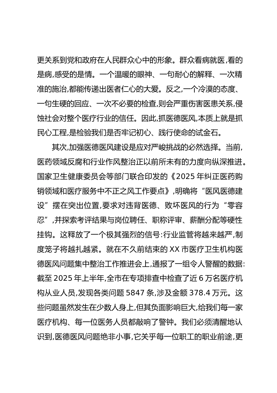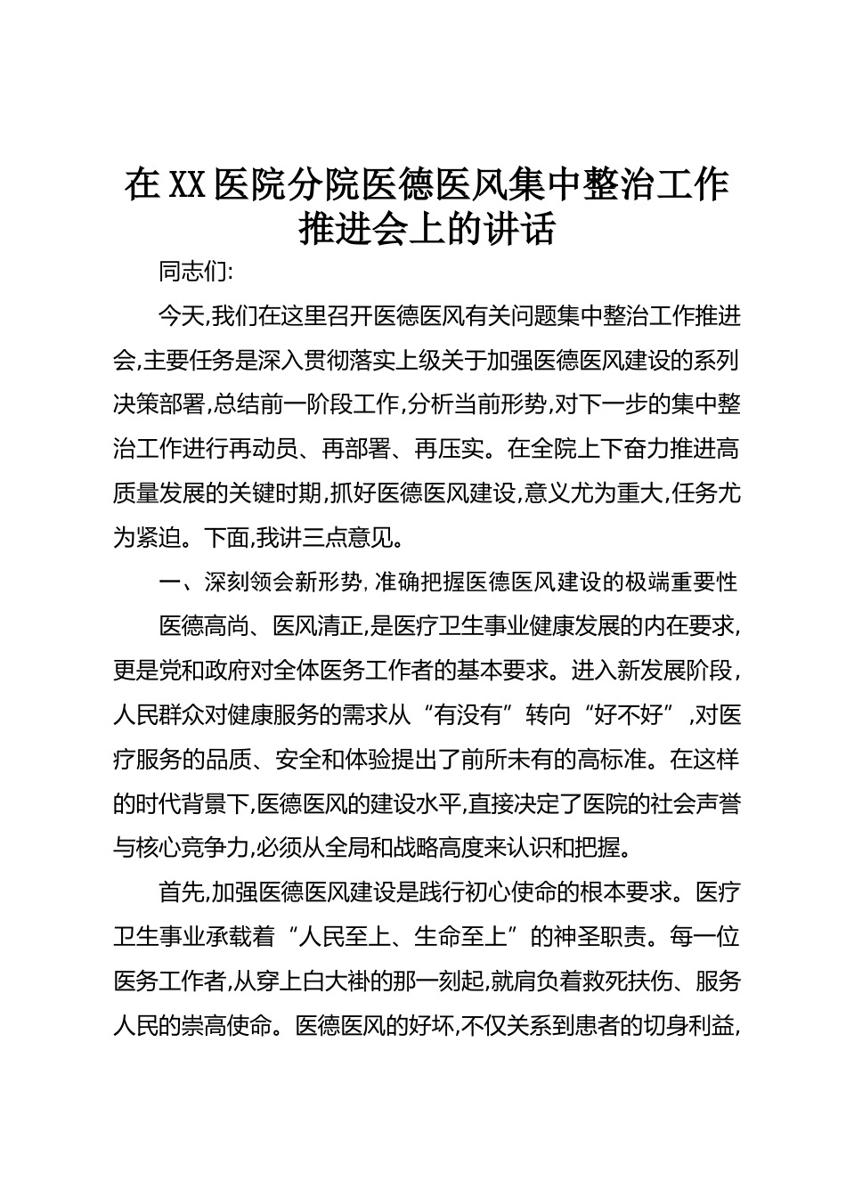 在XX醫(yī)院分院醫(yī)德醫(yī)風(fēng)集中整治工作推進(jìn)會(huì)上的講話同志們:今天,我們?cè)谶@里召開醫(yī)德醫(yī)風(fēng)有關(guān)問題集中整治工作推進(jìn)會(huì),主要任務(wù)是深入貫徹落實(shí)上級(jí)關(guān)于加強(qiáng)醫(yī)德醫(yī)風(fēng)建設(shè)的系列決策部署,總結(jié)前一階段工作,分析當(dāng)前形勢(shì),對(duì)下一步的集中整治工作進(jìn)行再動(dòng)員、再部署、再壓實(shí)。在全院上下奮力推進(jìn)高質(zhì)量發(fā)展的關(guān)鍵時(shí)期,抓好醫(yī)德醫(yī)風(fēng)建設(shè),意義尤為重大,任務(wù)尤為緊迫。下面,我講三點(diǎn)意見。一、深刻領(lǐng)會(huì)新形勢(shì),準(zhǔn)確把握醫(yī)德醫(yī)風(fēng)建設(shè)的極端重要性醫(yī)德高尚、醫(yī)風(fēng)清正,是醫(yī)療衛(wèi)生事業(yè)健康發(fā)展的內(nèi)在要求,更是黨和政府對(duì)全體醫(yī)務(wù)工作者的基本要求。進(jìn)入新發(fā)展階段,人民群眾對(duì)健康服務(wù)的需...