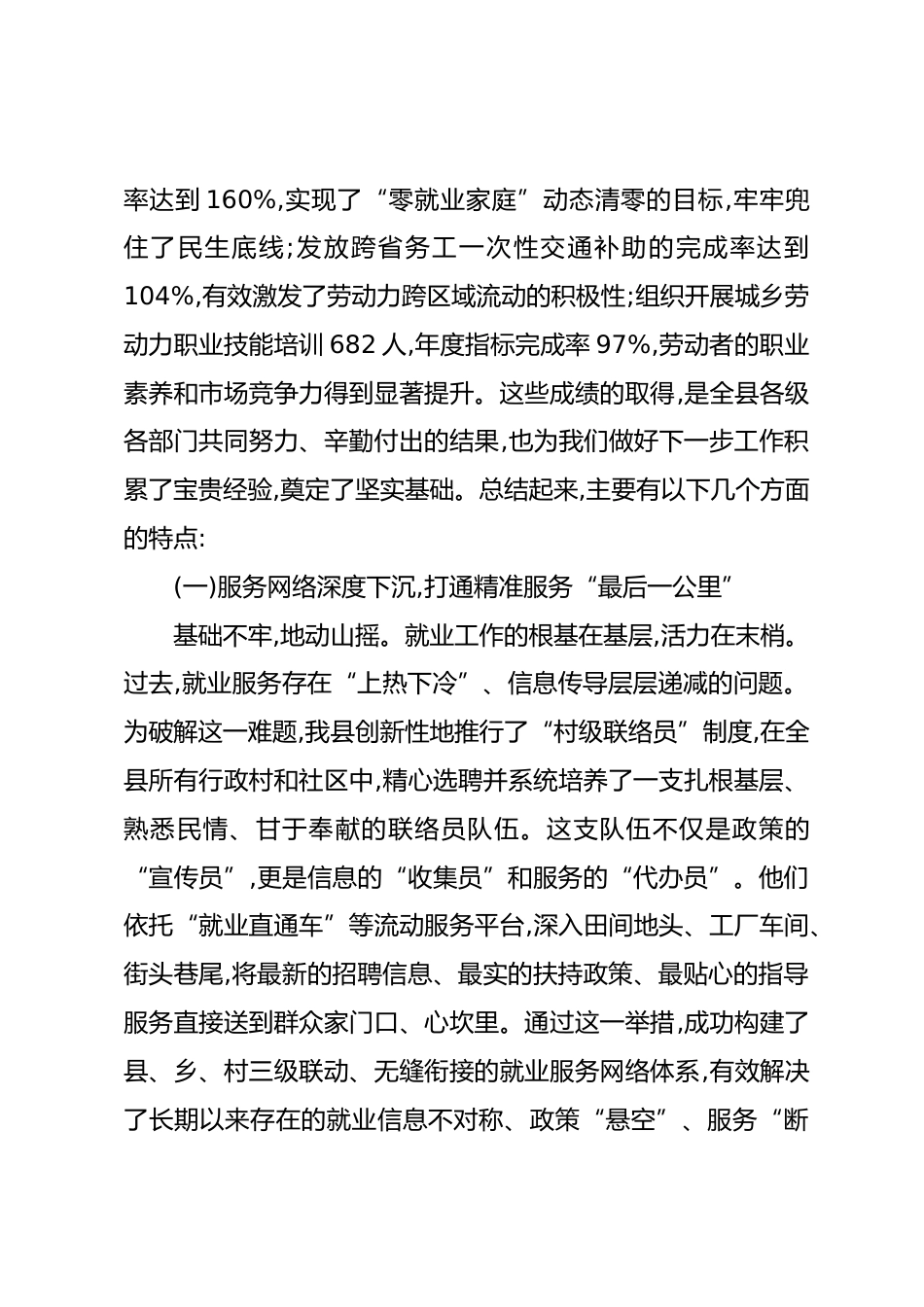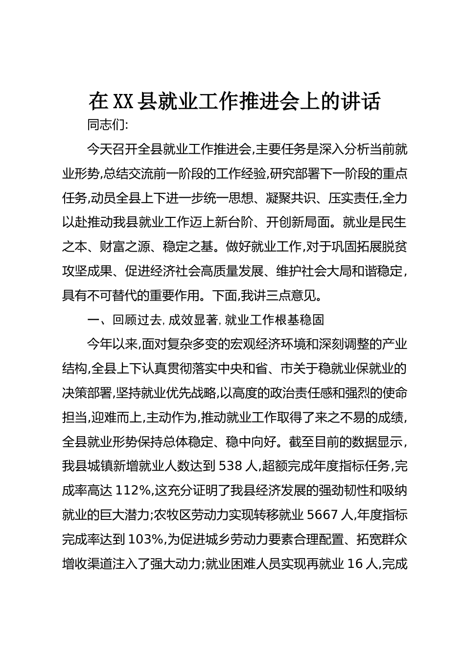 在XX縣就業(yè)工作推進(jìn)會(huì)上的講話同志們:今天召開全縣就業(yè)工作推進(jìn)會(huì),主要任務(wù)是深入分析當(dāng)前就業(yè)形勢,總結(jié)交流前一階段的工作經(jīng)驗(yàn),研究部署下一階段的重點(diǎn)任務(wù),動(dòng)員全縣上下進(jìn)一步統(tǒng)一思想、凝聚共識(shí)、壓實(shí)責(zé)任,全力以赴推動(dòng)我縣就業(yè)工作邁上新臺(tái)階、開創(chuàng)新局面。就業(yè)是民生之本、財(cái)富之源、穩(wěn)定之基。做好就業(yè)工作,對于鞏固拓展脫貧攻堅(jiān)成果、促進(jìn)經(jīng)濟(jì)社會(huì)高質(zhì)量發(fā)展、維護(hù)社會(huì)大局和諧穩(wěn)定,具有不可替代的重要作用。下面,我講三點(diǎn)意見。一、回顧過去,成效顯著,就業(yè)工作根基穩(wěn)固今年以來,面對復(fù)雜多變的宏觀經(jīng)濟(jì)環(huán)境和深刻調(diào)整的產(chǎn)業(yè)結(jié)構(gòu),全縣上下認(rèn)真貫徹落實(shí)中央和省、...