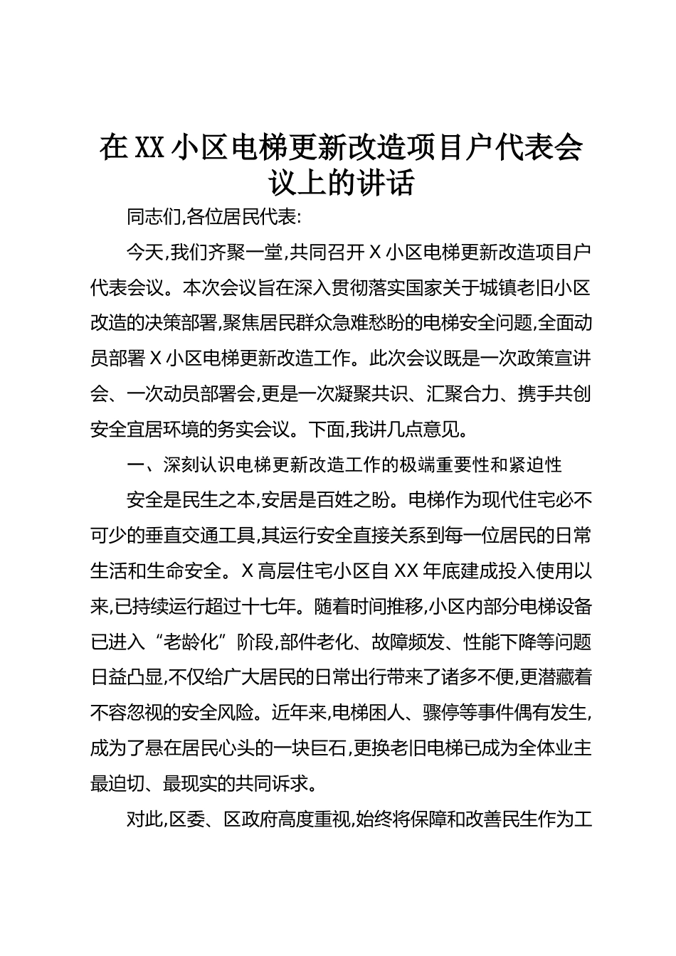 在XX小區(qū)電梯更新改造項目戶代表會議上的講話