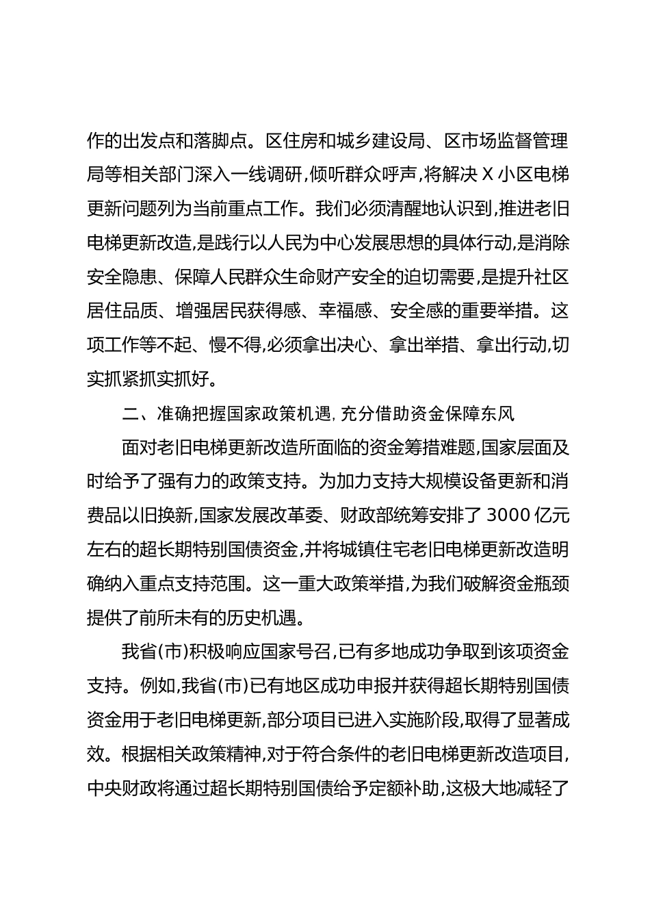 在XX小區(qū)電梯更新改造項目戶代表會議上的講話同志們,各位居民代表:今天,我們齊聚一堂,共同召開X小區(qū)電梯更新改造項目戶代表會議。本次會議旨在深入貫徹落實國家關于城鎮(zhèn)老舊小區(qū)改造的決策部署,聚焦居民群眾急難愁盼的電梯安全問題,全面動員部署X小區(qū)電梯更新改造工作。此次會議既是一次政策宣講會、一次動員部署會,更是一次凝聚共識、匯聚合力、攜手共創(chuàng)安全宜居環(huán)境的務實會議。下面,我講幾點意見。一、深刻認識電梯更新改造工作的極端重要性和緊迫性安全是民生之本,安居是百姓之盼。電梯作為現(xiàn)代住宅必不可少的垂直交通工具,其運行安全直接關系到每一位居民的日常生活...