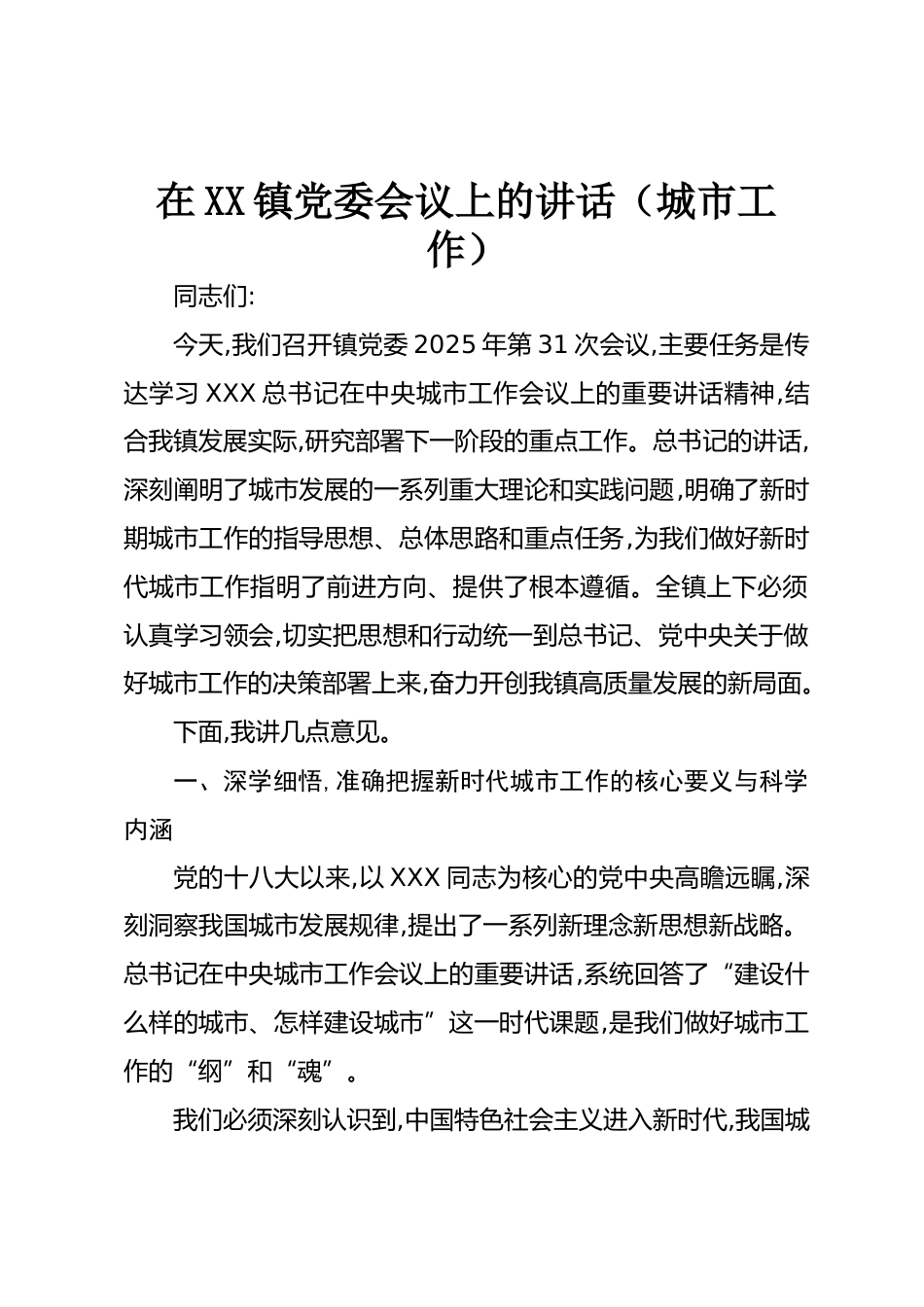 在XX鎮(zhèn)黨委會(huì)議上的講話(城市工作)同志們:今天,我們召開(kāi)鎮(zhèn)黨委2025年第31次會(huì)議,主要任務(wù)是傳達(dá)學(xué)習(xí)XXX總書(shū)記在中央城市工作會(huì)議上的重要講話精神,結(jié)合我鎮(zhèn)發(fā)展實(shí)際,研究部署下一階段的重點(diǎn)工作??倳?shū)記的講話,深刻闡明了城市發(fā)展的一系列重大理論和實(shí)踐問(wèn)題,明確了新時(shí)期城市工作的指導(dǎo)思想、總體思路和重點(diǎn)任務(wù),為我們做好新時(shí)代城市工作指明了前進(jìn)方向、提供了根本遵循。全鎮(zhèn)上下必須認(rèn)真學(xué)習(xí)領(lǐng)會(huì),切實(shí)把思想和行動(dòng)統(tǒng)一到總書(shū)記、黨中央關(guān)于做好城市工作的決策部署上來(lái),奮力開(kāi)創(chuàng)我鎮(zhèn)高質(zhì)量發(fā)展的新局面。下面,我講幾點(diǎn)意見(jiàn)。一、深學(xué)細(xì)悟,準(zhǔn)確把握新時(shí)代城市工作的...