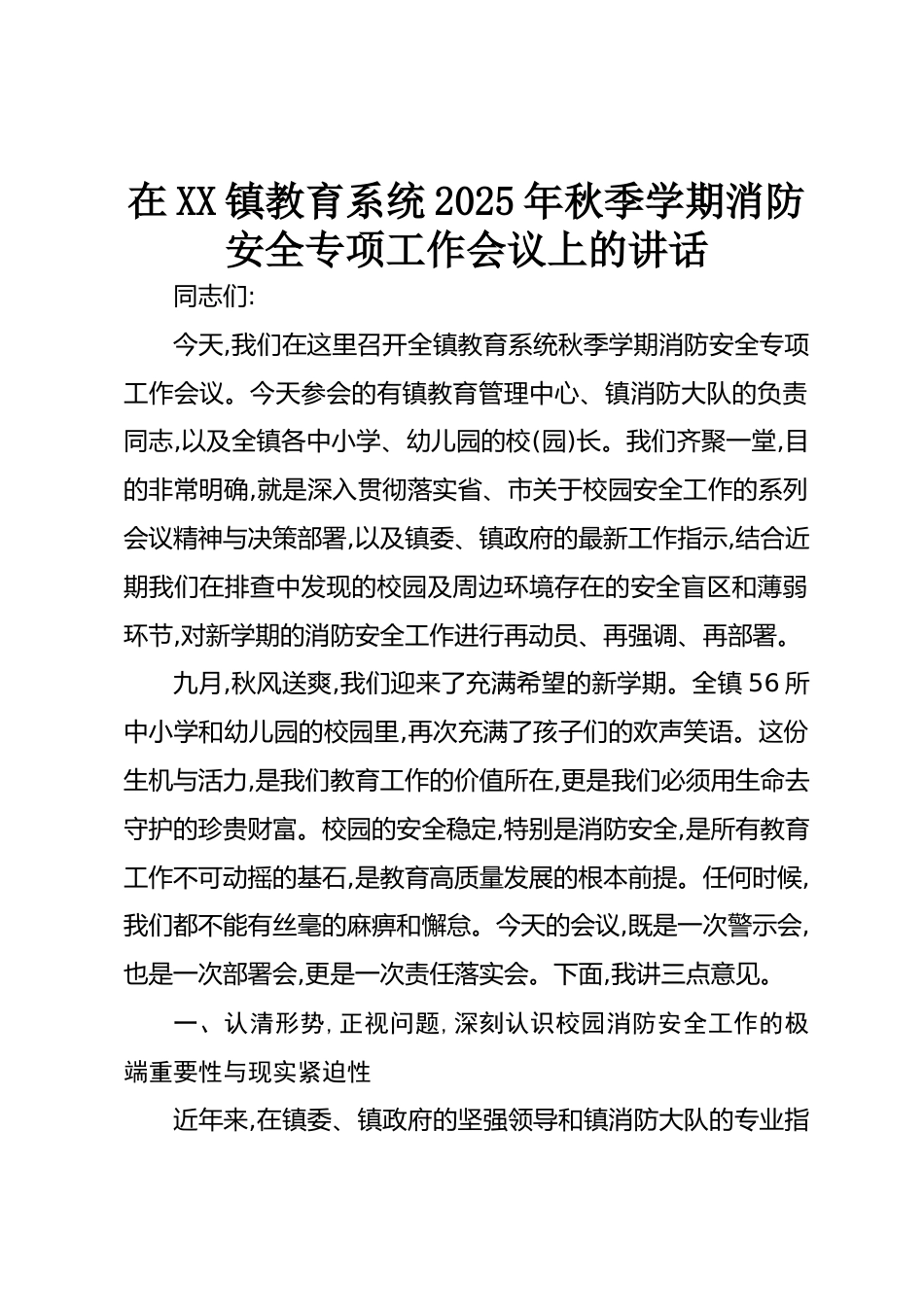 在XX鎮(zhèn)教育系統(tǒng)2025年秋季學(xué)期消防安全專項工作會議上的講話