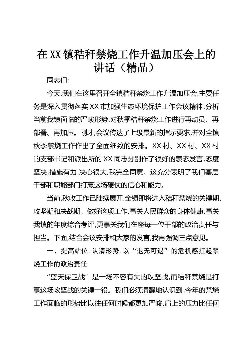 在XX鎮(zhèn)秸稈禁燒工作升溫加壓會(huì)上的講話(精品)同志們:今天,我們在這里召開全鎮(zhèn)秸稈禁燒工作升溫加壓會(huì),主要任務(wù)是深入貫徹落實(shí)XX市加強(qiáng)生態(tài)環(huán)境保護(hù)工作會(huì)議精神,分析當(dāng)前我鎮(zhèn)面臨的嚴(yán)峻形勢,對(duì)秋季秸稈禁燒工作進(jìn)行再動(dòng)員、再部署、再加壓。剛才,會(huì)議傳達(dá)了上級(jí)最新的指示要求,并對(duì)全鎮(zhèn)秋季禁燒工作作出了全面細(xì)致的安排。XX村、XX村、XX村的支部書記和派出所的XX同志分別作了很好的表態(tài)發(fā)言,態(tài)度堅(jiān)決,措施有力,決心很大,我完全同意。這充分表明了我們基層干部和職能部門打贏這場硬仗的信心和能力。當(dāng)前,秋收工作已陸續(xù)展開,全鎮(zhèn)即將進(jìn)入秸稈禁燒的關(guān)鍵期、攻堅(jiān)期和決...