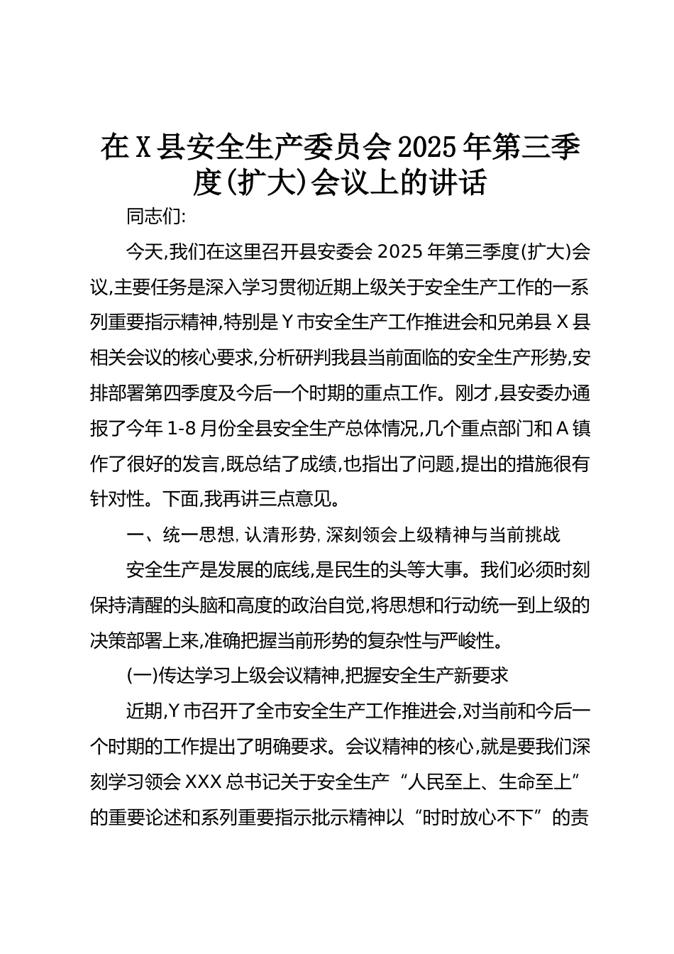 在X縣安全生產(chǎn)委員會(huì)2025年第三季度(擴(kuò)大)會(huì)議上的講話