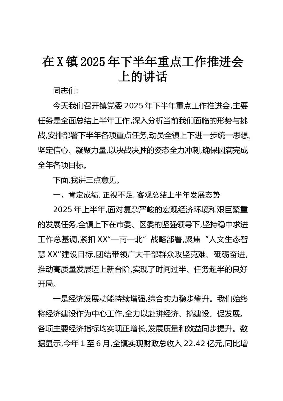 在X鎮(zhèn)2025年下半年重點(diǎn)工作推進(jìn)會(huì)上的講話