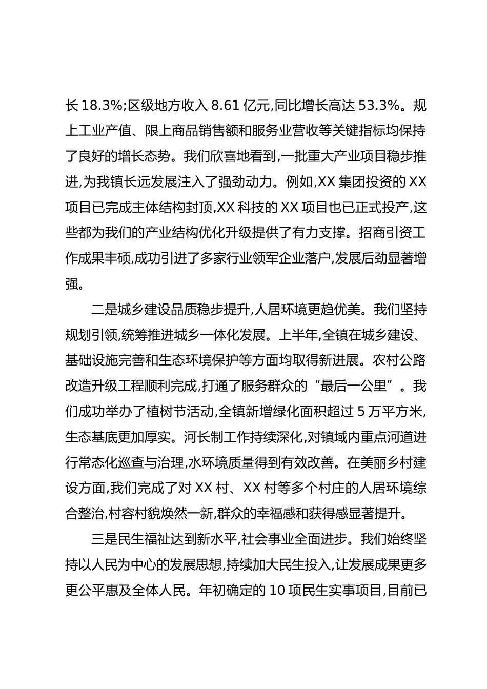 在X鎮(zhèn)2025年下半年重點(diǎn)工作推進(jìn)會(huì)上的講話同志們:今天我們召開鎮(zhèn)黨委2025年下半年重點(diǎn)工作推進(jìn)會(huì),主要任務(wù)是全面總結(jié)上半年工作,深入分析當(dāng)前我們面臨的形勢(shì)與挑戰(zhàn),安排部署下半年各項(xiàng)重點(diǎn)任務(wù),動(dòng)員全鎮(zhèn)上下進(jìn)一步統(tǒng)一思想、堅(jiān)定信心、凝聚力量,以決戰(zhàn)決勝的姿態(tài)全力沖刺,確保圓滿完成全年各項(xiàng)目標(biāo)。下面,我講三點(diǎn)意見。一、肯定成績(jī),正視不足,客觀總結(jié)上半年發(fā)展態(tài)勢(shì)2025年上半年,面對(duì)復(fù)雜嚴(yán)峻的宏觀經(jīng)濟(jì)環(huán)境和艱巨繁重的發(fā)展任務(wù),全鎮(zhèn)上下在市委、區(qū)委的堅(jiān)強(qiáng)領(lǐng)導(dǎo)下,堅(jiān)持穩(wěn)中求進(jìn)工作總基調(diào),緊扣XX“一南一北”戰(zhàn)略部署,聚焦“人文生態(tài)智慧XX”建設(shè)目標(biāo),團(tuán)結(jié)帶領(lǐng)廣大干...