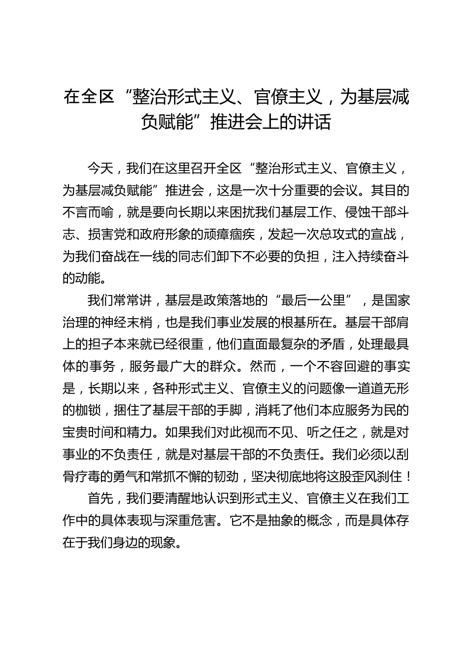 在全區(qū)“整治形式主義、官僚主義,為基層減負(fù)賦能”推進(jìn)會上的講話