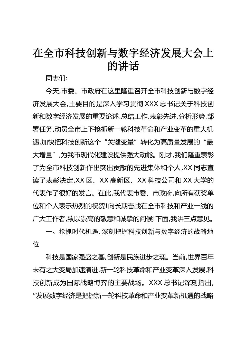 在全市科技創(chuàng)新與數(shù)字經(jīng)濟發(fā)展大會上的講話同志們:今天,市委、市政府在這里隆重召開全市科技創(chuàng)新與數(shù)字經(jīng)濟發(fā)展大會,主要目的是深入學(xué)習(xí)貫徹XXX總書記關(guān)于科技創(chuàng)新和數(shù)字經(jīng)濟發(fā)展的重要論述,總結(jié)工作,表彰先進,分析形勢,部署任務(wù),動員全市上下?lián)屪バ乱惠喛萍几锩彤a(chǎn)業(yè)變革的重大機遇,加快把科技創(chuàng)新這個“關(guān)鍵變量”轉(zhuǎn)化為高質(zhì)量發(fā)展的“最大增量”,為我市現(xiàn)代化建設(shè)提供強大動能。剛才,我們隆重表彰了為全市科技創(chuàng)新作出突出貢獻的先進集體和個人,XX同志宣讀了表彰決定,XX區(qū)、XX高新區(qū)、XX科技公司和XX大學(xué)的代表作了很好的發(fā)言。在此,我代表市委、市政府,向所有獲獎單...