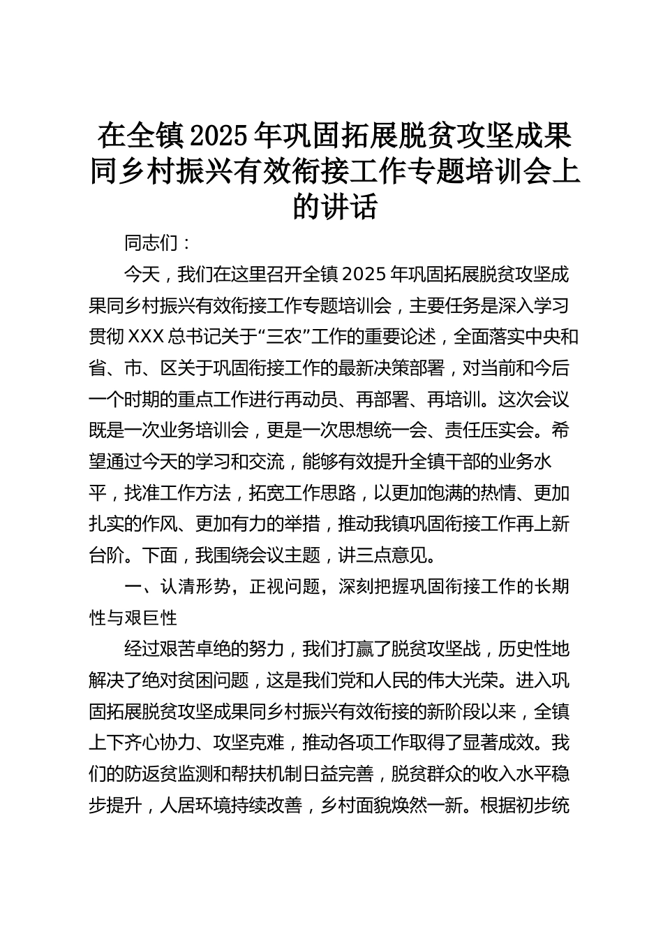 在全鎮(zhèn)2025年鞏固拓展脫貧攻堅成果同鄉(xiāng)村振興有效銜接工作專題培訓(xùn)會上的講話同志們:今天,我們在這里召開全鎮(zhèn)2025年鞏固拓展脫貧攻堅成果同鄉(xiāng)村振興有效銜接工作專題培訓(xùn)會,主要任務(wù)是深入學(xué)習(xí)貫徹XXX“”總書記關(guān)于三農(nóng)工作的重要論述,全面落實中央和省、市、區(qū)關(guān)于鞏固銜接工作的最新決策部署,對當(dāng)前和今后一個時期的重點工作進(jìn)行再動員、再部署、再培訓(xùn)。這次會議既是一次業(yè)務(wù)培訓(xùn)會,更是一次思想統(tǒng)一會、責(zé)任壓實會。希望通過今天的學(xué)習(xí)和交流,能夠有效提升全鎮(zhèn)干部的業(yè)務(wù)水平,找準(zhǔn)工作方法,拓寬工作思路,以更加飽滿的熱情、更加扎實的作風(fēng)、更加有力的舉...