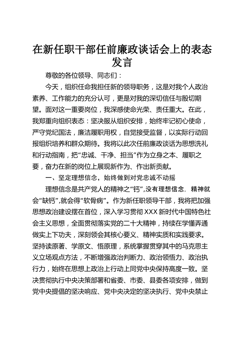 在新任職干部任前廉政談話會(huì)上的表態(tài)發(fā)言尊敬的各位領(lǐng)導(dǎo)、同志們:今天,組織任命我擔(dān)任新的領(lǐng)導(dǎo)職務(wù),這是對我個(gè)人政治素養(yǎng)、工作能力的充分認(rèn)可,更是對我的深切信任與殷切期望。面對這一重要崗位,我深感使命光榮、責(zé)任重大。在此,我鄭重向組織表態(tài):堅(jiān)決服從組織安排,始終牢記初心使命,嚴(yán)守黨紀(jì)國法,廉潔履職用權(quán),自覺接受監(jiān)督,以實(shí)際行動(dòng)回報(bào)組織培養(yǎng)和群眾期待。我將以此次任前廉政談話為思想洗禮“”和行動(dòng)指南,把忠誠、干凈、擔(dān)當(dāng)作為立身之本、履職之要,奮力在新的崗位上展現(xiàn)新作為、作出新貢獻(xiàn)。一、堅(jiān)定理想信念,始終做到對黨忠誠不動(dòng)搖“”理想信念...