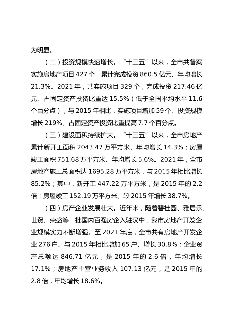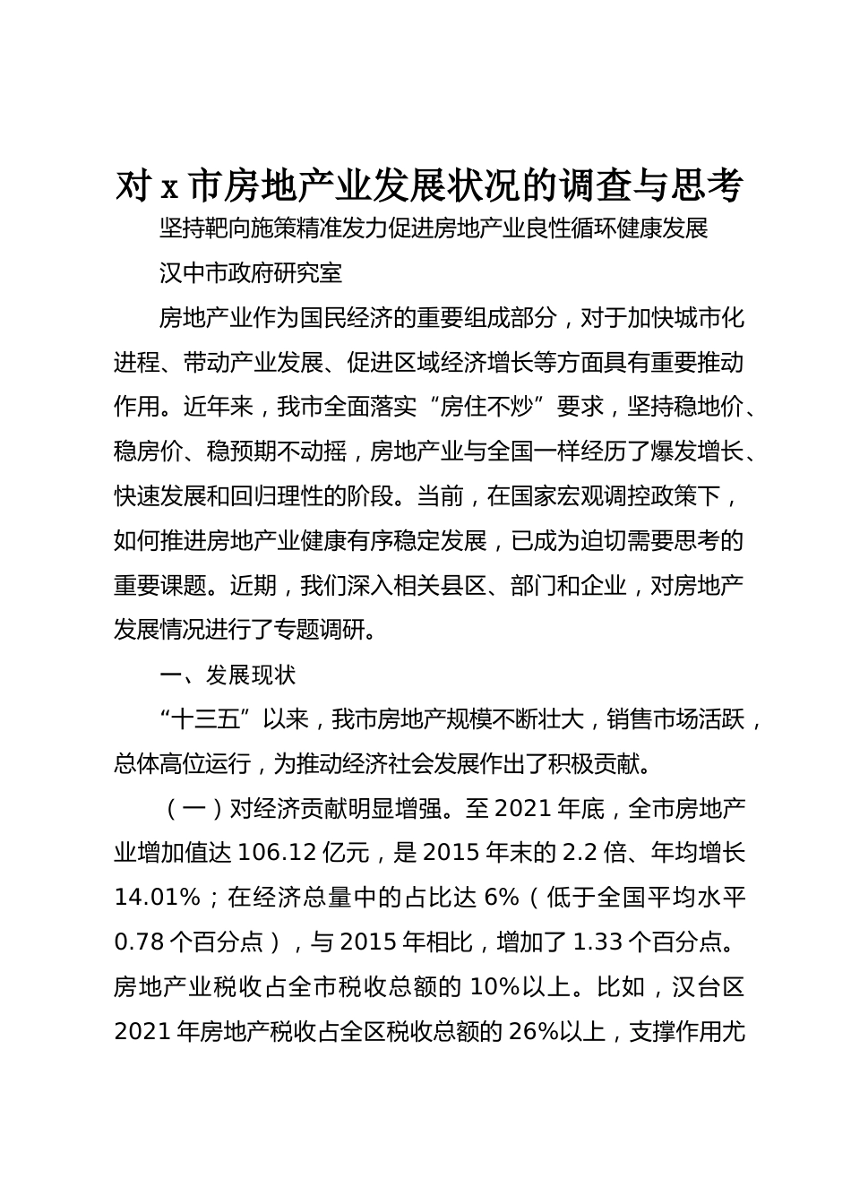 對x市房地產業(yè)發(fā)展狀況的調查與思考堅持靶向施策精準發(fā)力促進房地產業(yè)良性循環(huán)健康發(fā)展?jié)h中市政府研究室房地產業(yè)作為國民經濟的重要組成部分,對于加快城市化進程、帶動產業(yè)發(fā)展、促進區(qū)域經濟增長等方面具有重要推動作用。近年來,我市全面落實“房住不炒”要求,堅持穩(wěn)地價、穩(wěn)房價、穩(wěn)預期不動搖,房地產業(yè)與全國一樣經歷了爆發(fā)增長、快速發(fā)展和回歸理性的階段。當前,在國家宏觀調控政策下,如何推進房地產業(yè)健康有序穩(wěn)定發(fā)展,已成為迫切需要思考的重要課題。近期,我們深入相關縣區(qū)、部門和企業(yè),對房地產發(fā)展情況進行了專題調研。一、發(fā)展現狀“十三五”以來,我...