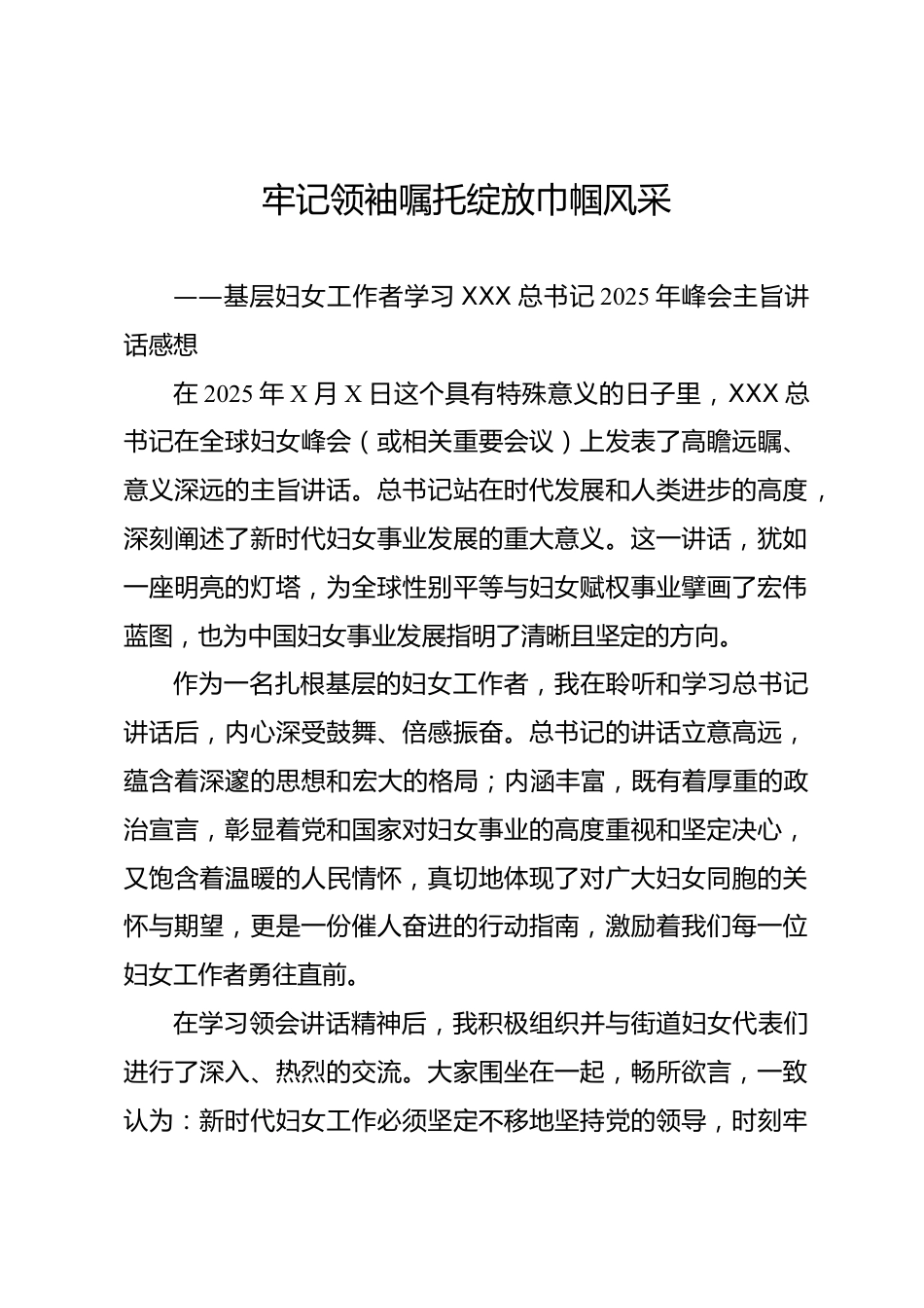 牢記領(lǐng)袖囑托綻放巾幗風(fēng)采——基層婦女工作者學(xué)習(xí)XXX總書記2025年峰會主旨講話感想在2025年X月X日這個具有特殊意義的日子里,XXX總書記在全球婦女峰會(或相關(guān)重要會議)上發(fā)表了高瞻遠(yuǎn)矚、意義深遠(yuǎn)的主旨講話。總書記站在時代發(fā)展和人類進(jìn)步的高度,深刻闡述了新時代婦女事業(yè)發(fā)展的重大意義。這一講話,猶如一座明亮的燈塔,為全球性別平等與婦女賦權(quán)事業(yè)擘畫了宏偉藍(lán)圖,也為中國婦女事業(yè)發(fā)展指明了清晰且堅定的方向。作為一名扎根基層的婦女工作者,我在聆聽和學(xué)習(xí)總書記講話后,內(nèi)心深受鼓舞、倍感振奮??倳浀闹v話立意高遠(yuǎn),蘊(yùn)含著深邃的思想和宏大的格局;內(nèi)涵豐...