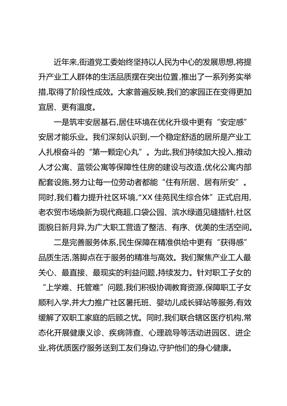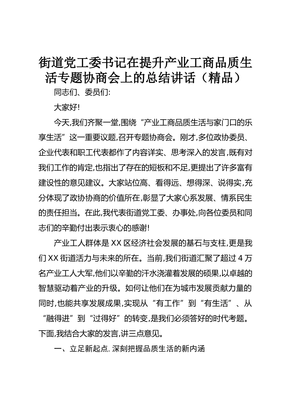 街道黨工委書記在提升產(chǎn)業(yè)工商品質(zhì)生活專題協(xié)商會上的總結(jié)講話(精品)同志們、委員們:大家好!今天,我們齊聚一堂,圍繞“產(chǎn)業(yè)工商品質(zhì)生活與家門口的樂享生活”這一重要議題,召開專題協(xié)商會。剛才,多位政協(xié)委員、企業(yè)代表和職工代表都作了內(nèi)容詳實、思考深入的發(fā)言,既有對我們工作的肯定,也指出了存在的短板和不足,更提出了許多富有建設(shè)性的意見建議。大家站位高、看得遠(yuǎn)、想得深、說得實,充分體現(xiàn)了政協(xié)協(xié)商的價值所在,彰顯了大家心系發(fā)展、情系民生的責(zé)任擔(dān)當(dāng)。在此,我代表街道黨工委、辦事處,向各位委員和同志們的辛勤付出表示衷心的感謝!產(chǎn)業(yè)工人群體是XX區(qū)經(jīng)濟(jì)社會發(fā)...