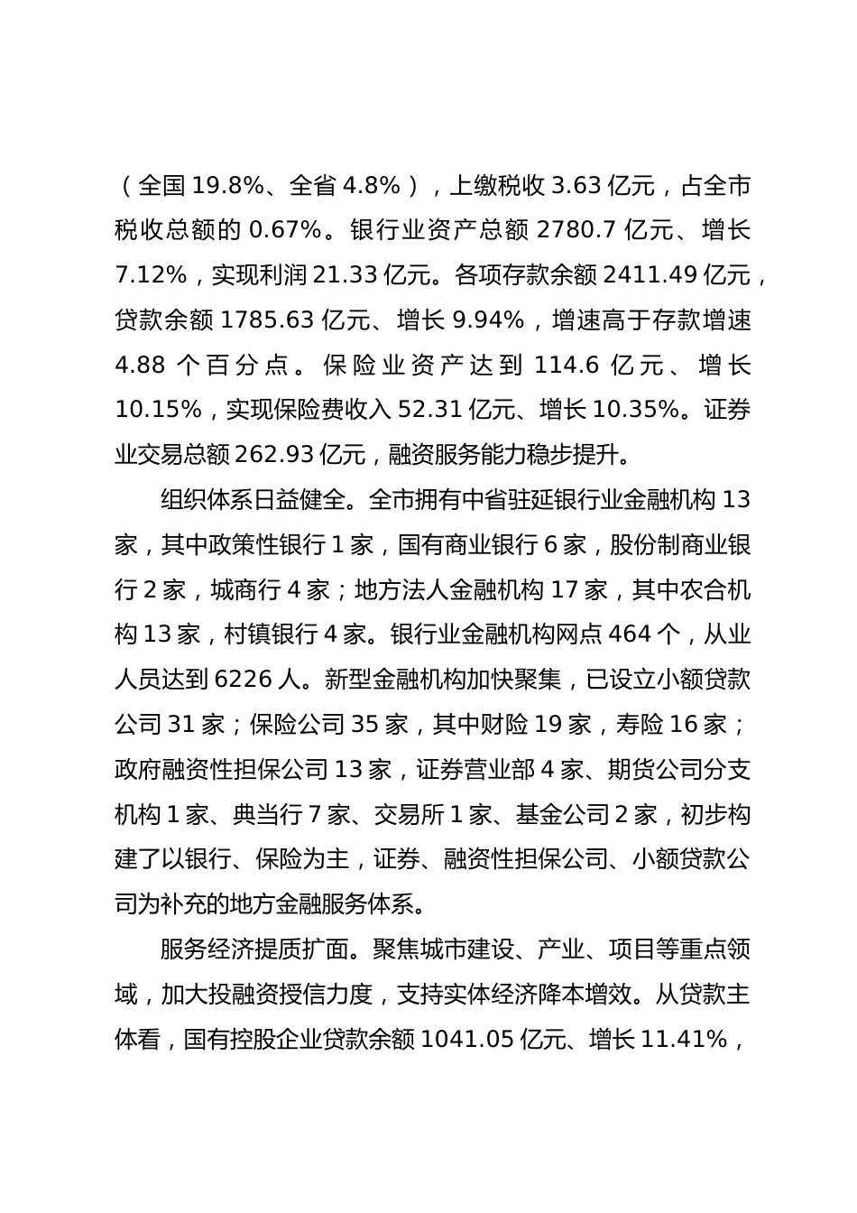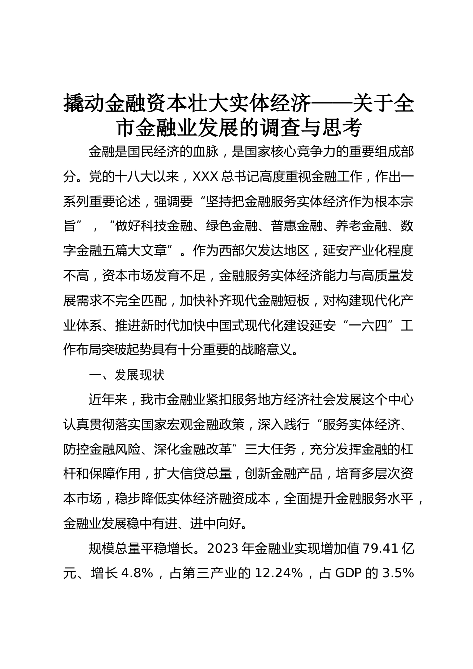 撬動金融資本壯大實體經(jīng)濟——關于全市金融業(yè)發(fā)展的調查與思考金融是國民經(jīng)濟的血脈,是國家核心競爭力的重要組成部分。黨的十八大以來,XXX總書記高度重視金融工作,作出一系列重要論述,強調要“堅持把金融服務實體經(jīng)濟作為根本宗旨”,“做好科技金融、綠色金融、普惠金融、養(yǎng)老金融、數(shù)字金融五篇大文章”。作為西部欠發(fā)達地區(qū),延安產(chǎn)業(yè)化程度不高,資本市場發(fā)育不足,金融服務實體經(jīng)濟能力與高質量發(fā)展需求不完全匹配,加快補齊現(xiàn)代金融短板,對構建現(xiàn)代化產(chǎn)業(yè)體系、推進新時代加快中國式現(xiàn)代化建設延安“一六四”工作布局突破起勢具有十分重要的戰(zhàn)略意義。一、發(fā)...