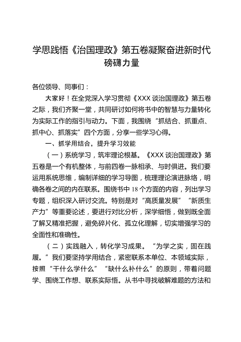 學(xué)思踐悟《治國理政》第五卷凝聚奮進(jìn)新時(shí)代磅礴力量各位領(lǐng)導(dǎo)、同事們:大家好!在全黨深入學(xué)習(xí)貫徹《XXX談治國理政》第五卷之際,我們齊聚一堂,共同研討如何將書中的智慧與力量轉(zhuǎn)化為實(shí)際工作的指引與動(dòng)力。下面,我圍繞“抓結(jié)合、抓重點(diǎn)、抓中心、抓落實(shí)”四個(gè)方面,分享一些學(xué)習(xí)心得。一、抓學(xué)用結(jié)合,提升學(xué)習(xí)效能(一)系統(tǒng)學(xué)習(xí),筑牢理論根基。《XXX談治國理政》第五卷是一個(gè)有機(jī)整體,與前四卷一脈相承、與時(shí)俱進(jìn)。我們要運(yùn)用系統(tǒng)思維,編制詳細(xì)的學(xué)習(xí)導(dǎo)圖,梳理理論演進(jìn)脈絡(luò),明確各卷之間的內(nèi)在聯(lián)系。圍繞書中18個(gè)方面的內(nèi)容,列出學(xué)習(xí)專題,組織深入研討交流。...