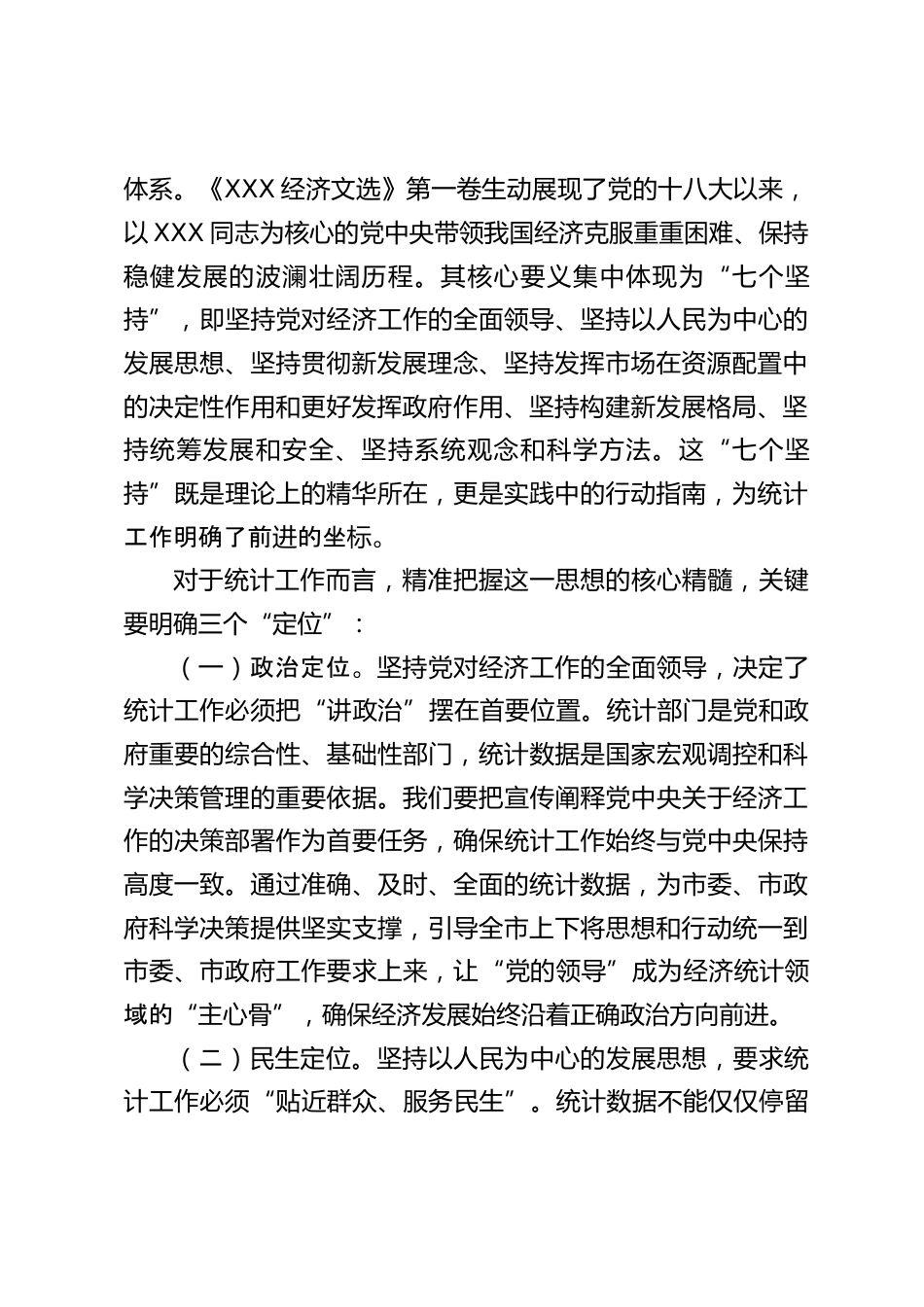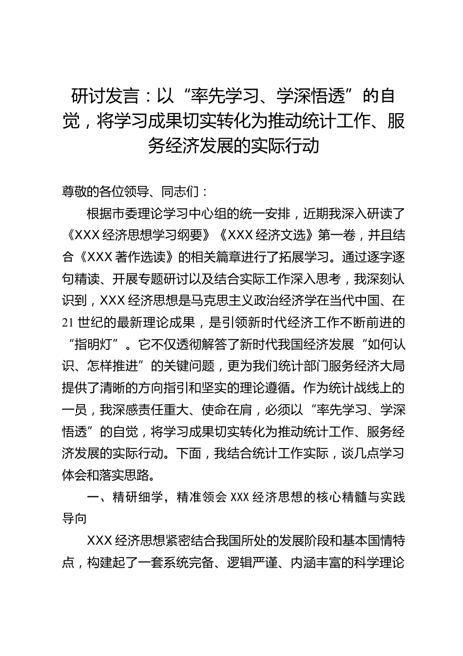 研討發(fā)言:以“率先學(xué)習(xí)、學(xué)深悟透”的自覺,將學(xué)習(xí)成果切實(shí)轉(zhuǎn)化為推動(dòng)統(tǒng)計(jì)工作、服務(wù)經(jīng)濟(jì)發(fā)展的實(shí)際行動(dòng)尊敬的各位領(lǐng)導(dǎo)、同志們:根據(jù)市委理論學(xué)習(xí)中心組的統(tǒng)一安排,近期我深入研讀了《XXX經(jīng)濟(jì)思想學(xué)習(xí)綱要》《XXX經(jīng)濟(jì)文選》第一卷,并且結(jié)合《XXX著作選讀》的相關(guān)篇章進(jìn)行了拓展學(xué)習(xí)。通過逐字逐句精讀、開展專題研討以及結(jié)合實(shí)際工作深入思考,我深刻認(rèn)識(shí)到,XXX經(jīng)濟(jì)思想是馬克思主義政治經(jīng)濟(jì)學(xué)在當(dāng)代中國、在21世紀(jì)的最新理論成果,是引領(lǐng)新時(shí)代經(jīng)濟(jì)工作不斷前進(jìn)的“指明燈”。它不僅透徹解答了新時(shí)代我國經(jīng)濟(jì)發(fā)展“如何認(rèn)識(shí)、怎樣推進(jìn)”的關(guān)鍵問題,更為我們統(tǒng)計(jì)部...