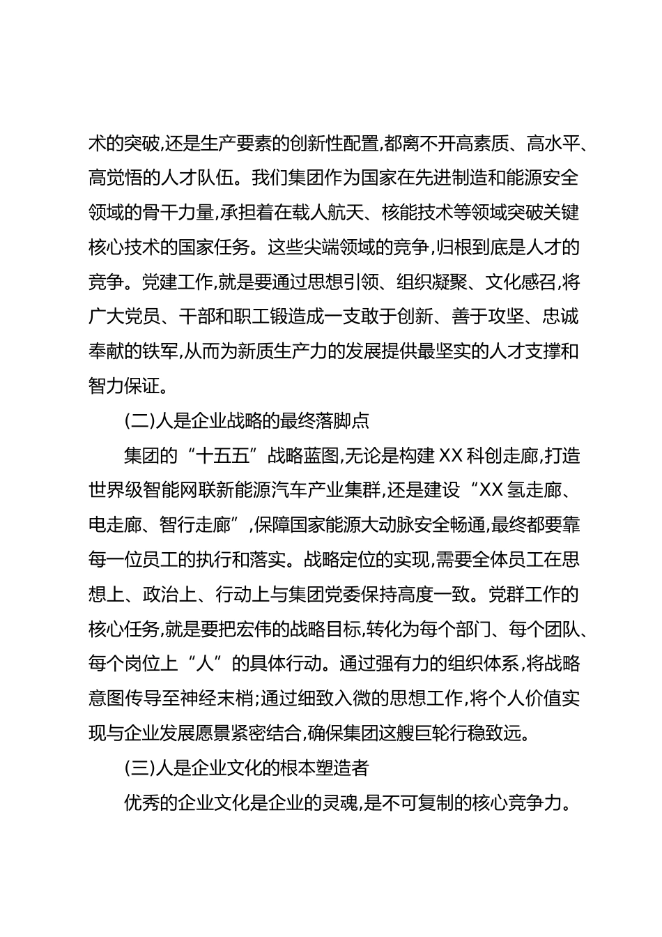 在集團(tuán)“十五五”黨群業(yè)務(wù)系統(tǒng)規(guī)劃專題研討會(huì)上的發(fā)言今天,我們召開集團(tuán)“十五五”黨群業(yè)務(wù)系統(tǒng)規(guī)劃專題研討會(huì),主要任務(wù)是深入學(xué)習(xí)貫徹新時(shí)代黨的建設(shè)總要求,聚焦“新質(zhì)生產(chǎn)力”和“高質(zhì)量發(fā)展”兩大關(guān)鍵詞,專題研討“新時(shí)代如何深刻理解與系統(tǒng)把握‘黨建是做人的工作’這一核心要義”,為科學(xué)擘畫集團(tuán)未來五年黨群工作的宏偉藍(lán)圖奠定堅(jiān)實(shí)的思想與理論基礎(chǔ)?!包h建是做人的工作”,這一論斷深刻揭示了黨的建設(shè)的本質(zhì)規(guī)律和內(nèi)在要求。在集團(tuán)邁向世界一流、服務(wù)國(guó)家戰(zhàn)略的關(guān)鍵時(shí)期,我們比以往任何時(shí)候都更需要激發(fā)人的創(chuàng)造力、凝聚人的向心力、提升人的戰(zhàn)斗力。因此,將這一核...