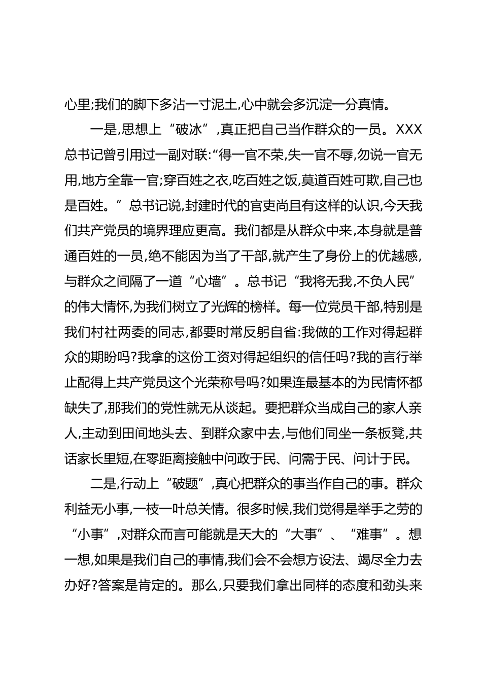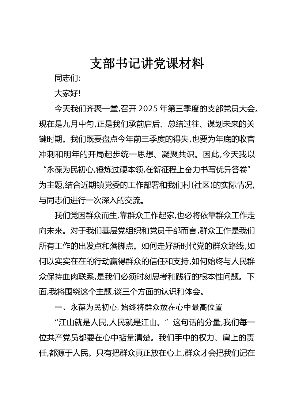 支部書記講黨課材料同志們:大家好!今天我們齊聚一堂,召開2025年第三季度的支部黨員大會?,F(xiàn)在是九月中旬,正是我們承前啟后、總結(jié)過往、謀劃未來的關(guān)鍵時期。我們既要盤點今年前三季度的得失,也要為年底的收官沖刺和明年的開局起步統(tǒng)一思想、凝聚共識。因此,今天我以“永葆為民初心,錘煉過硬本領(lǐng),在新征程上奮力書寫優(yōu)異答卷”為主題,結(jié)合近期鎮(zhèn)黨委的工作部署和我們村(社區(qū))的實際情況,與同志們進行一次深入的交流。我們黨因群眾而生,靠群眾工作起家,也必將依靠群眾工作走向未來。對于我們基層黨組織和黨員干部而言,群眾工作是我們所有工作的出發(fā)點和落腳點。如何走好新...