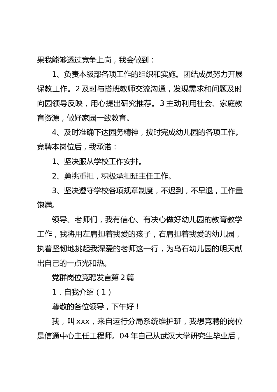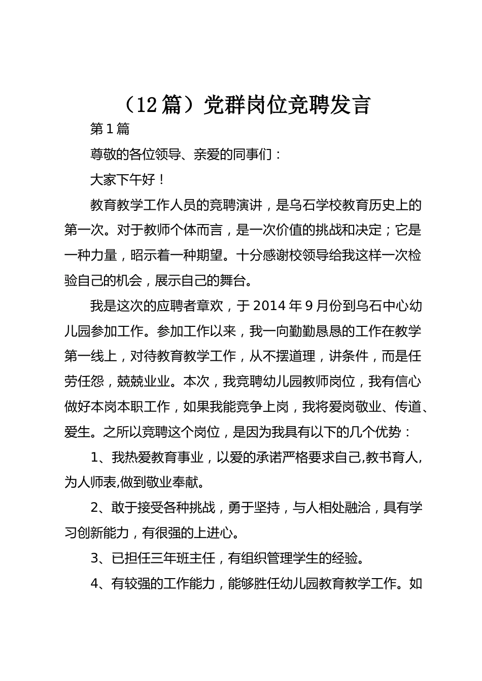 (12篇)黨群崗位競聘發(fā)言第1篇尊敬的各位領(lǐng)導(dǎo)、親愛的同事們:大家下午好!教育教學(xué)工作人員的競聘演講,是烏石學(xué)校教育歷史上的第一次。對(duì)于教師個(gè)體而言,是一次價(jià)值的挑戰(zhàn)和決定;它是一種力量,昭示著一種期望。十分感謝校領(lǐng)導(dǎo)給我這樣一次檢驗(yàn)自己的機(jī)會(huì),展示自己的舞臺(tái)。我是這次的應(yīng)聘者章歡,于2014年9月份到烏石中心幼兒園參加工作。參加工作以來,我一向勤勤懇懇的工作在教學(xué)第一線上,對(duì)待教育教學(xué)工作,從不擺道理,講條件,而是任勞任怨,兢兢業(yè)業(yè)。本次,我競聘幼兒園教師崗位,我有信心做好本崗本職工作,如果我能競爭上崗,我將愛崗敬業(yè)、傳道、愛生。...