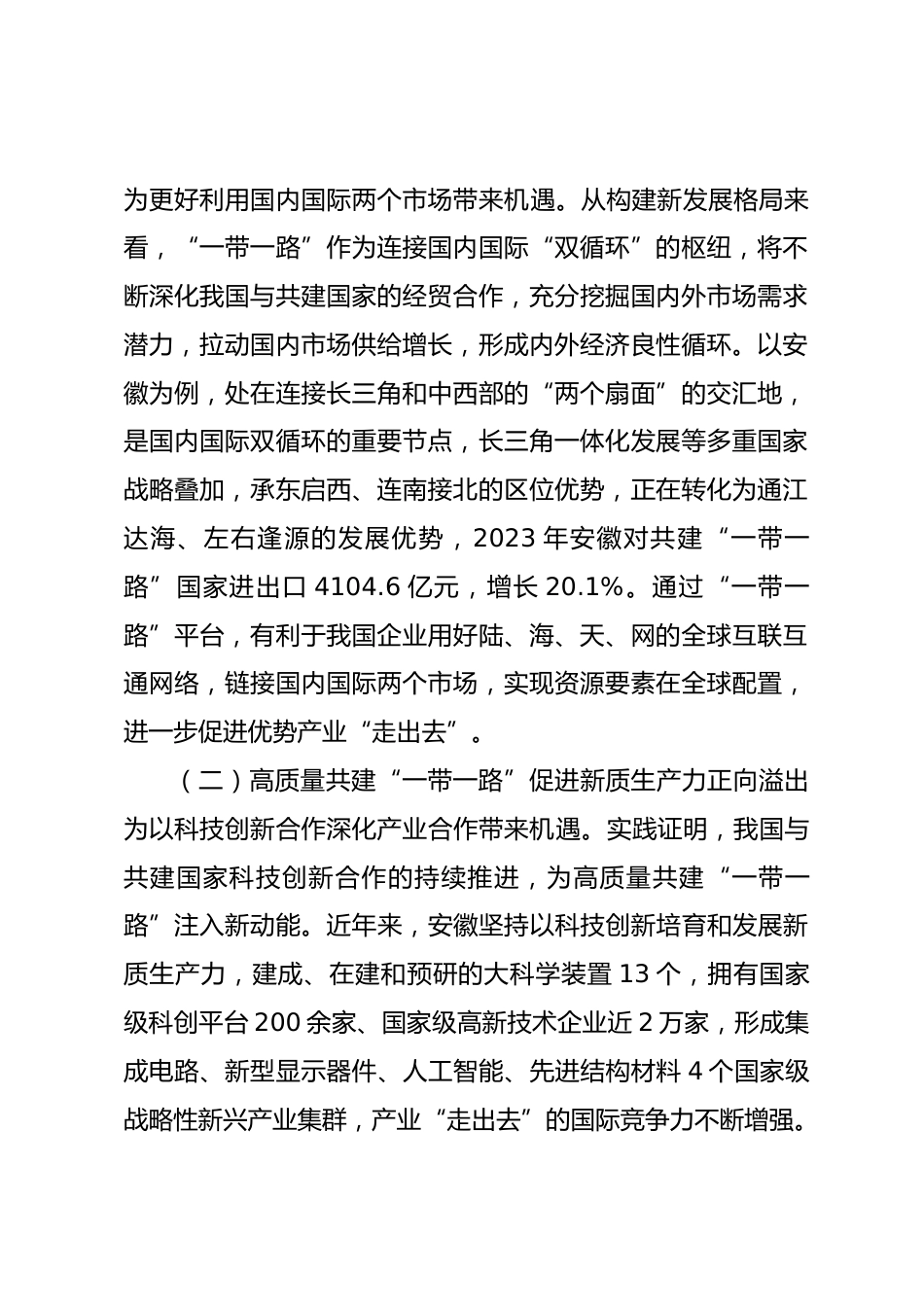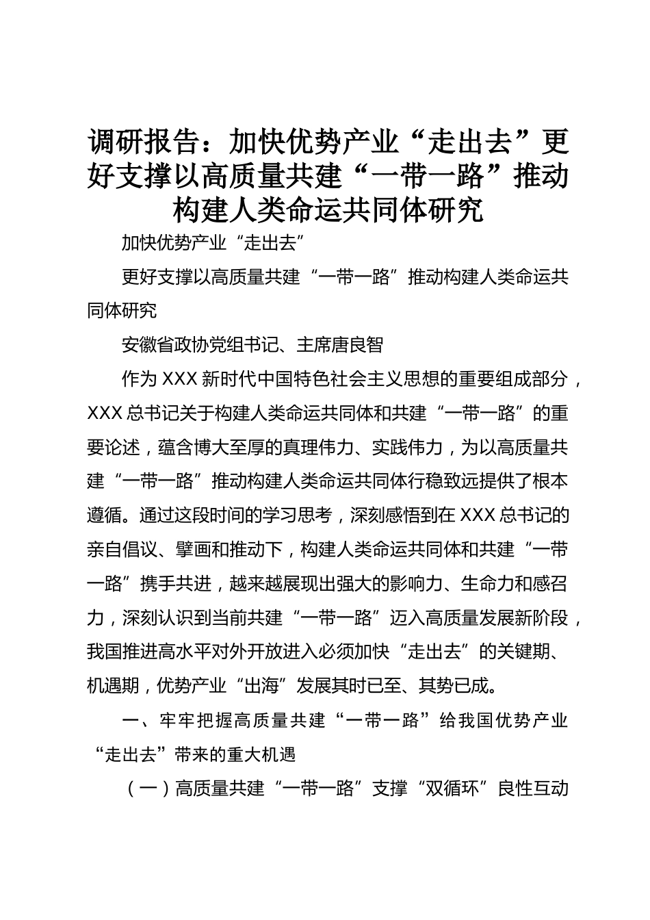 調(diào)研報(bào)告:加快優(yōu)勢產(chǎn)業(yè)“走出去”更好支撐以高質(zhì)量共建“一帶一路”推動(dòng)構(gòu)建人類命運(yùn)共同體研究加快優(yōu)勢產(chǎn)業(yè)“走出去”更好支撐以高質(zhì)量共建“一帶一路”推動(dòng)構(gòu)建人類命運(yùn)共同體研究安徽省政協(xié)黨組書記、主席唐良智作為XXX新時(shí)代中國特色社會(huì)主義思想的重要組成部分,XXX總書記關(guān)于構(gòu)建人類命運(yùn)共同體和共建“一帶一路”的重要論述,蘊(yùn)含博大至厚的真理偉力、實(shí)踐偉力,為以高質(zhì)量共建“一帶一路”推動(dòng)構(gòu)建人類命運(yùn)共同體行穩(wěn)致遠(yuǎn)提供了根本遵循。通過這段時(shí)間的學(xué)習(xí)思考,深刻感悟到在XXX總書記的親自倡議、擘畫和推動(dòng)下,構(gòu)建人類命運(yùn)共同體和共建“一帶一路”攜手共...