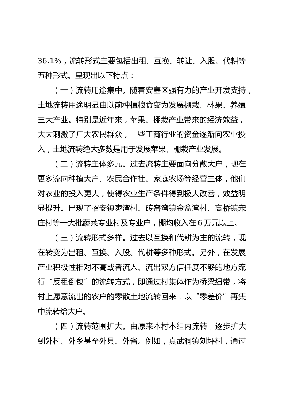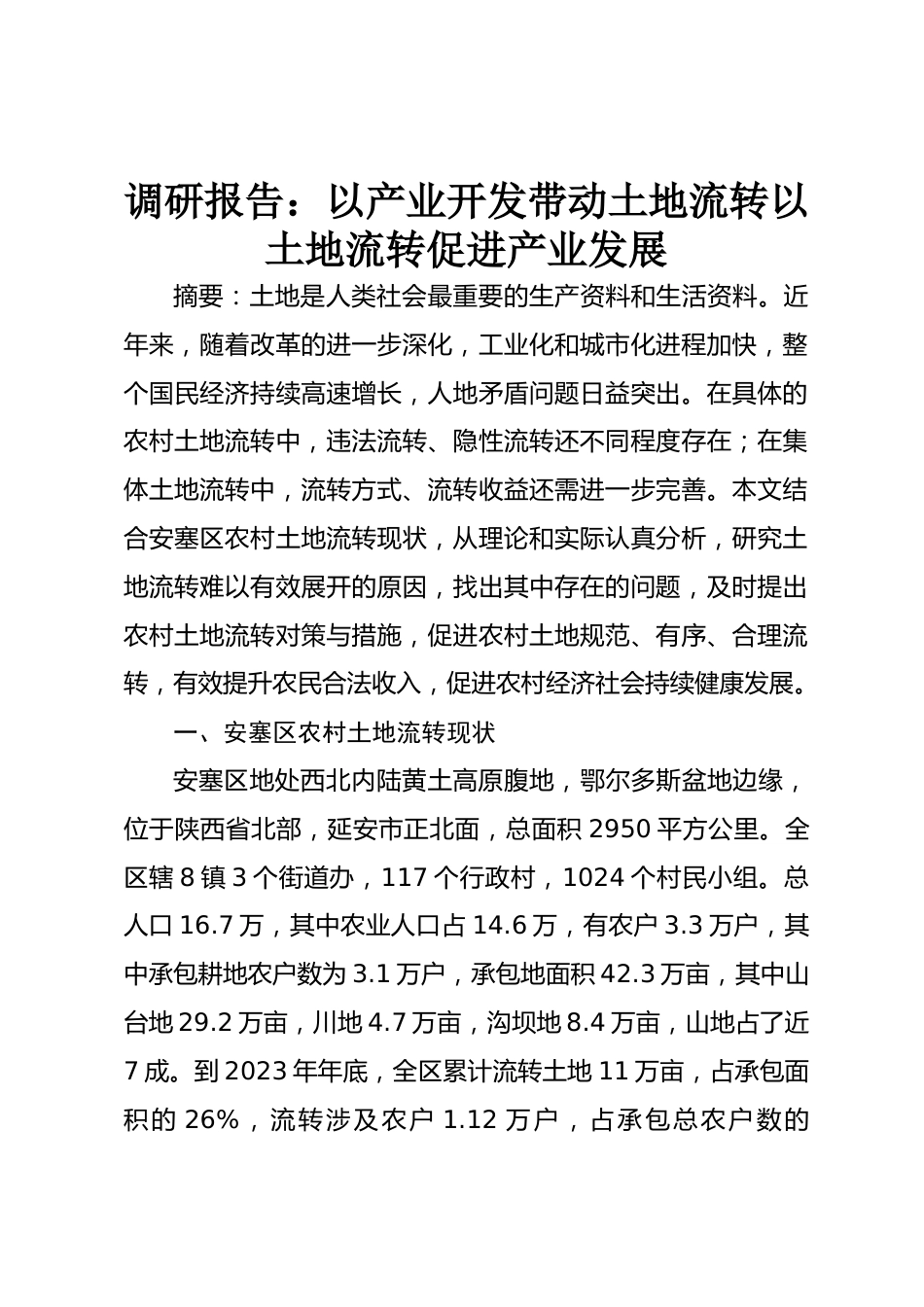 調(diào)研報告:以產(chǎn)業(yè)開發(fā)帶動土地流轉(zhuǎn)以土地流轉(zhuǎn)促進(jìn)產(chǎn)業(yè)發(fā)展摘要:土地是人類社會最重要的生產(chǎn)資料和生活資料。近年來,隨著改革的進(jìn)一步深化,工業(yè)化和城市化進(jìn)程加快,整個國民經(jīng)濟(jì)持續(xù)高速增長,人地矛盾問題日益突出。在具體的農(nóng)村土地流轉(zhuǎn)中,違法流轉(zhuǎn)、隱性流轉(zhuǎn)還不同程度存在;在集體土地流轉(zhuǎn)中,流轉(zhuǎn)方式、流轉(zhuǎn)收益還需進(jìn)一步完善。本文結(jié)合安塞區(qū)農(nóng)村土地流轉(zhuǎn)現(xiàn)狀,從理論和實際認(rèn)真分析,研究土地流轉(zhuǎn)難以有效展開的原因,找出其中存在的問題,及時提出農(nóng)村土地流轉(zhuǎn)對策與措施,促進(jìn)農(nóng)村土地規(guī)范、有序、合理流轉(zhuǎn),有效提升農(nóng)民合法收入,促進(jìn)農(nóng)村經(jīng)濟(jì)社會持續(xù)健...